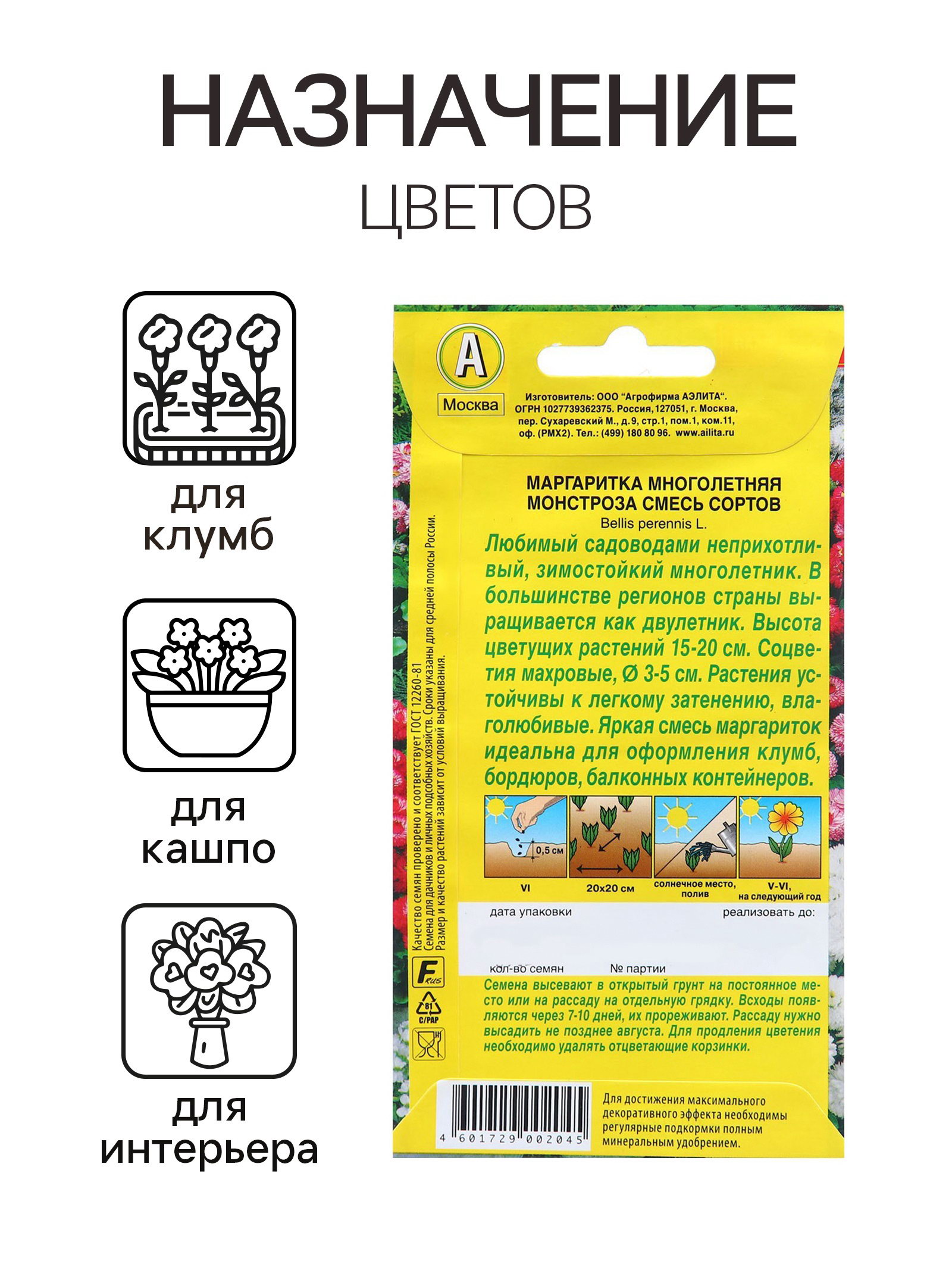 Размер упаковки: 8 x 0.1 x 15 см. Особенности выращивания: Открытый грунт Вид: Маргаритка Сухоцвет: Нет Махровые: Да Назначение: Для создания цветников, клумбы Вегетация: Многолетники По форме куста: Кустовая Отношение к свету: Светолюбивые Разновидность: Цветущее Нуждаются ли в стратификации: Нет tnved: 1209999900 tnved: 1209999900 Температурное ограничение: Нет Цвет: МИКС Агрономический срок годности, лет: 3 "Любимый садоводами неприхотливый зимостойкий многолетник. В большинстве регионов страны выращивается как двулетник. Высота цветущих растений 15-20 см Соцветия махровые, ? 3-5 см Растения устойчивы к легкому затенению, зимостойкие. Яркая смесь маргариток идеальна для оформления клумб, бордюров, балконных контейнеров. Семена высевают в открытый грунт на постоянное место или на рассаду на отдельную грядку. Всходы появляются через 7-10 дней, их прореживают. Рассаду нужно высадить не позднее августа. Для продления цветения необходимо удалять отцветающие корзинки." | ||