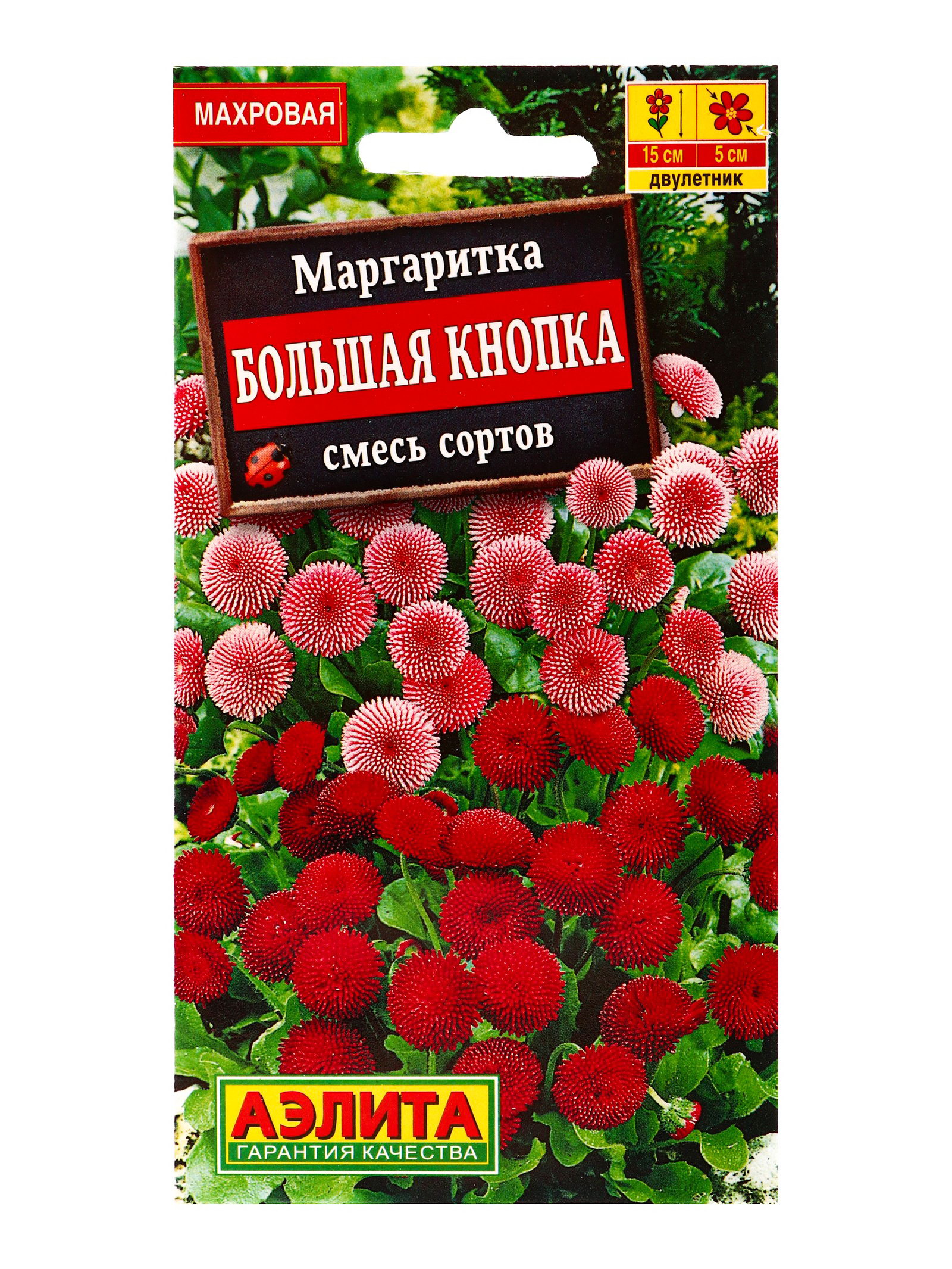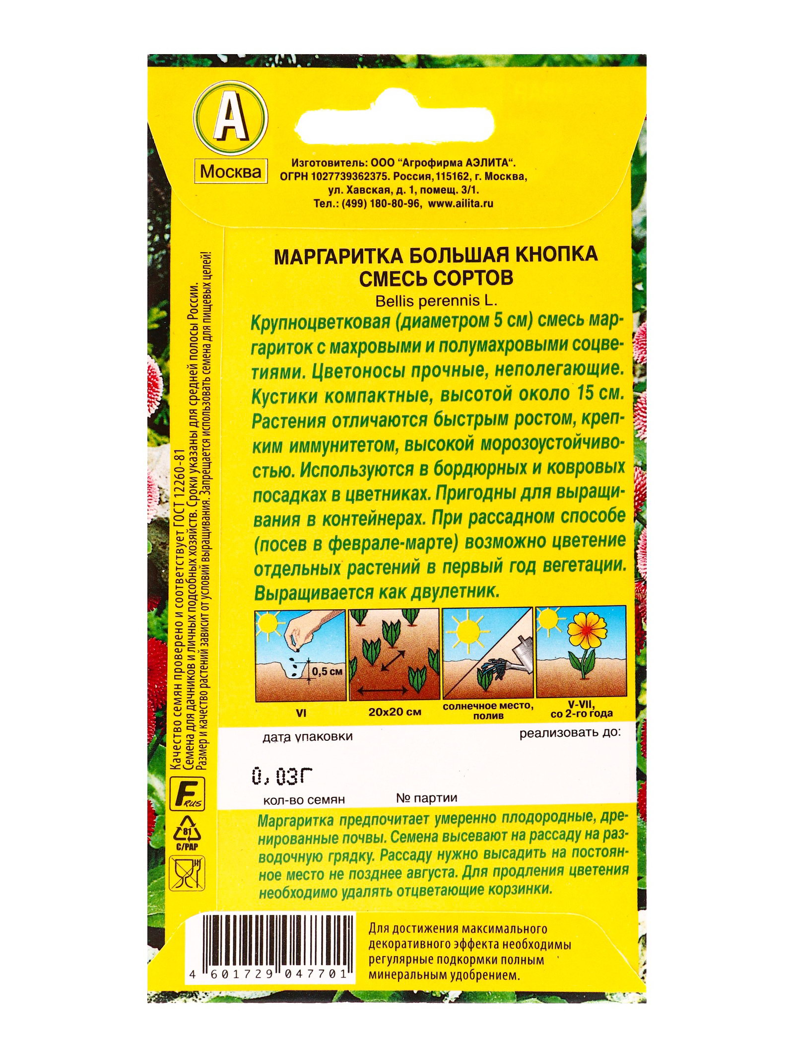 Семена цветов Маргаритка "Большая кнопка", смесь сортов, двулетник, 0.03 г, Агрофирма АЭЛИТА, Нидерланды