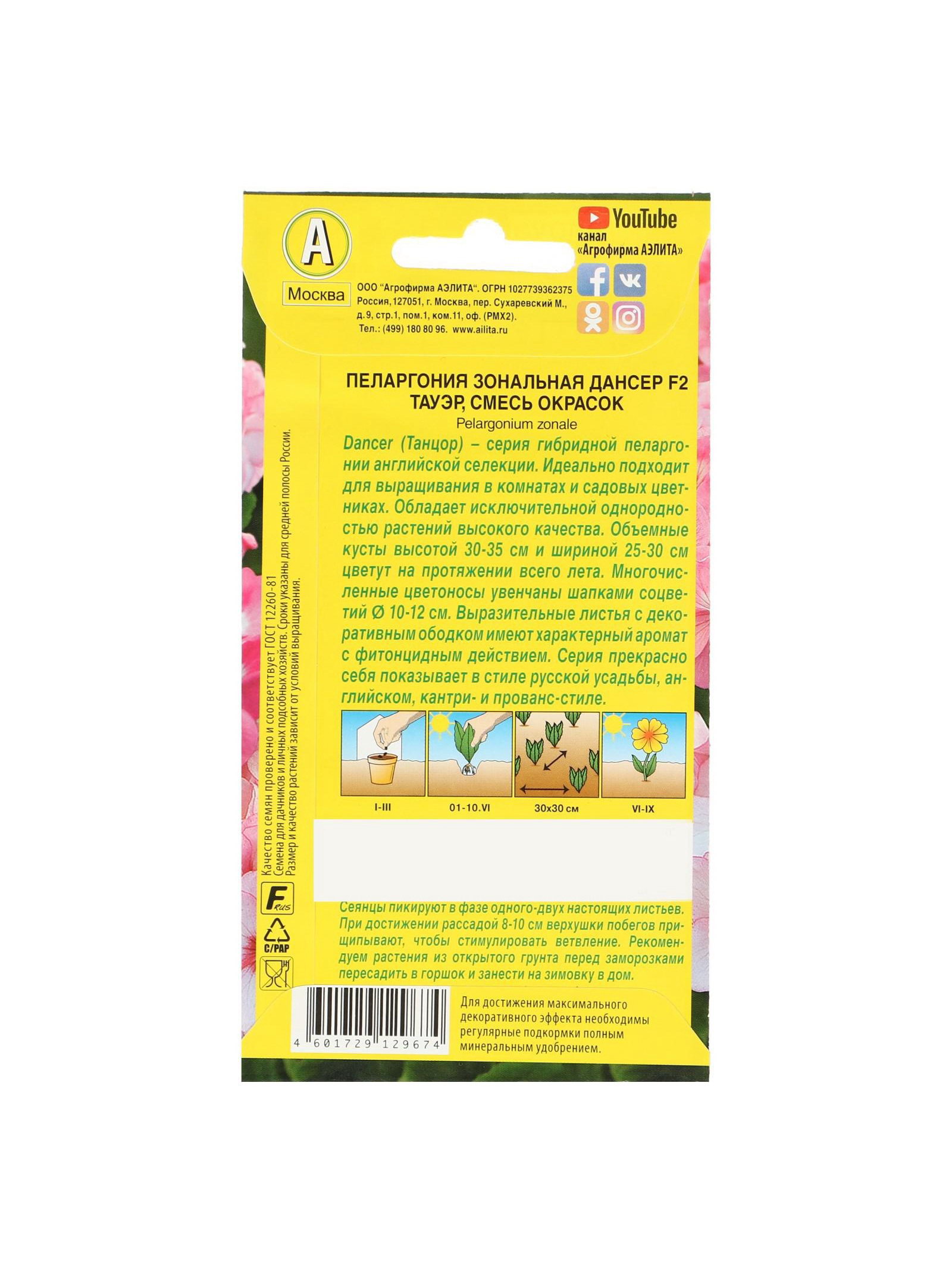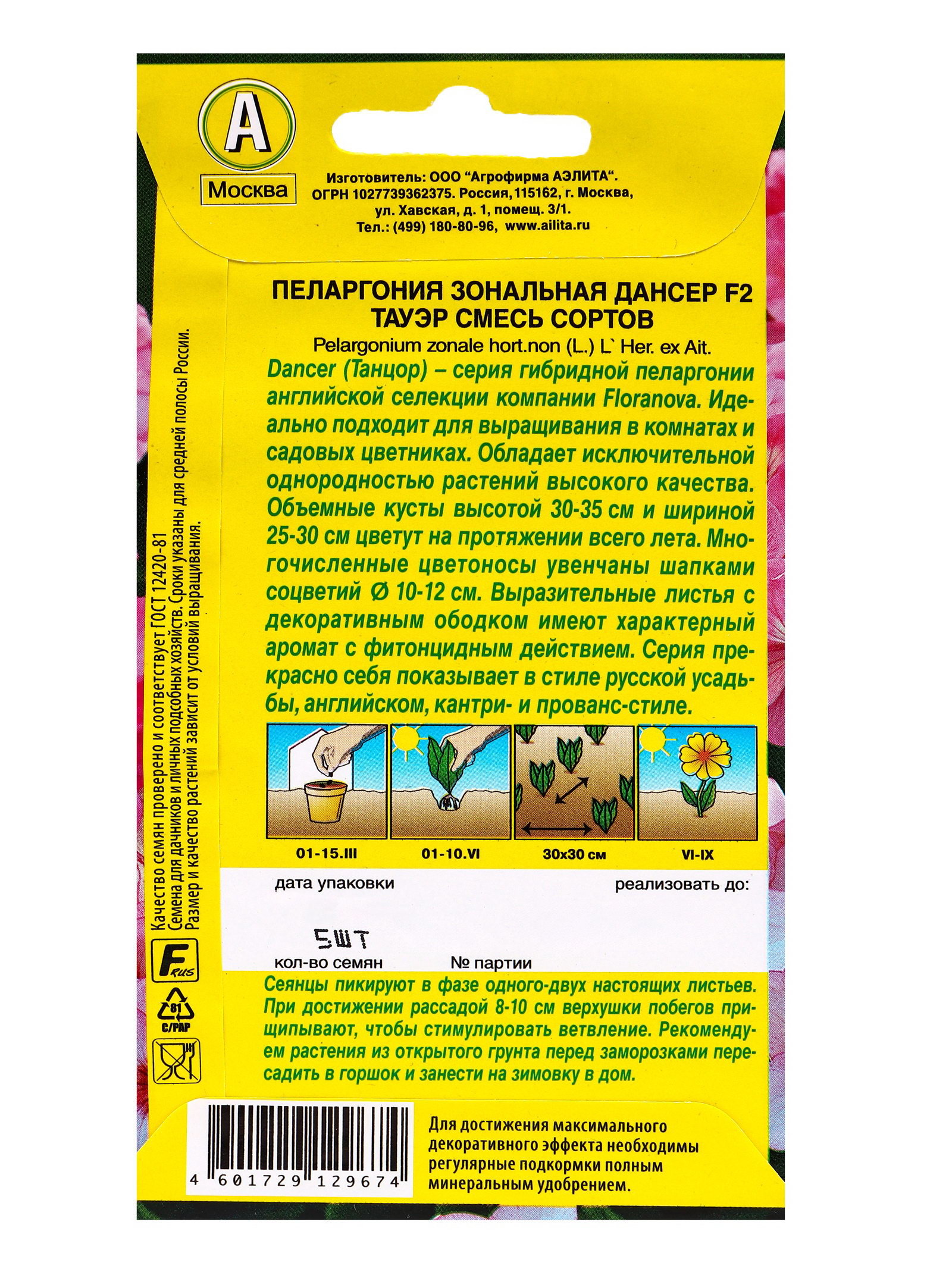 Вегетация: Многолетники, Однолетники Особенности выращивания: Комнатное выращивание, Открытый грунт, Подоконник, балкон Вид: Пеларгония, Семечки Посев на рассаду: Декабрь, Март, Ноябрь, Февраль, Январь Посев (посадка) в грунт: Апрель, Июль, Июнь, Май, Март Цветение период: Апрель, Июль, Июнь, Май Цвет: МИКС, Розовый Агрономический срок годности, лет: 3, 5 Размер упаковки: 8 x 0.2 x 15 см. Махровые: Нет Сухоцвет: Нет По форме куста: Кустовая Назначение: Для создания цветников, клумбы Отношение к свету: Рассеянный свет Подходит для балкона: Нет Разновидность: Цветущее Нуждаются ли в стратификации: Нет Высота, см: 40 tnved: 1209300000 tnved: 1209300000 Температурное ограничение: Нет Пеларгония Дансер F2 Тауэр - неприхотливый, но очень эффектный гибрид. Широко выращивается как комнатный многолетник или как летник в саду. Растет быстро, зацветает уже через три месяца после посева. Формирует компактные кустики высотой 30-35 см и шириной 25-30 см Соцветия крупные, 10-12 см в диаметре. Растения устойчивы к болезням и вредителям, хорошо переносят непогоду и перепады температур, достаточно засухоустойчивые. Украсят балконные ящики, садовые вазы, подходят для клумб, бордюров, рабаток. При выращивании в доме на солнечных подоконниках цветут круглый год. Посев и уход. Выращивают через рассаду. Сеянцы пикируют в фазе одного-двух настоящих листьев. При достижении рассадой 8-10 см верхушки побегов прищипывают, чтобы стимулировать ветвление. Высаживают рассаду в открытый грунт, когда минует угроза заморозков. Сеянцы регулярно опрыскивают, а потом из маленькой лейки с мелкими дырочками аккуратно поливают, но не допускают переувлажнения всходов, поддерживают температуру в помещении от +21, до+24℃. | ||