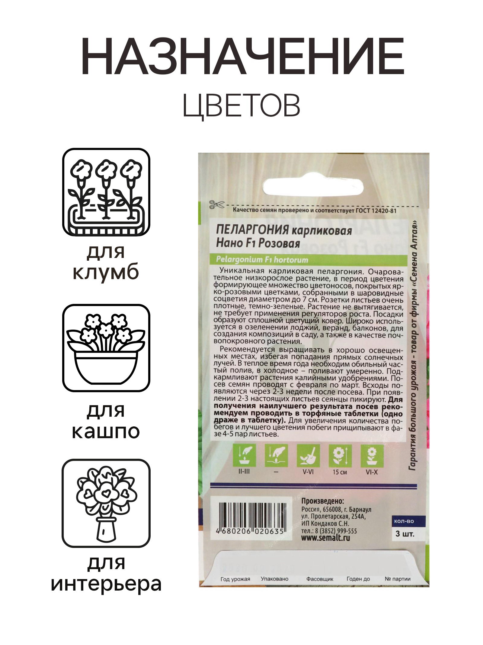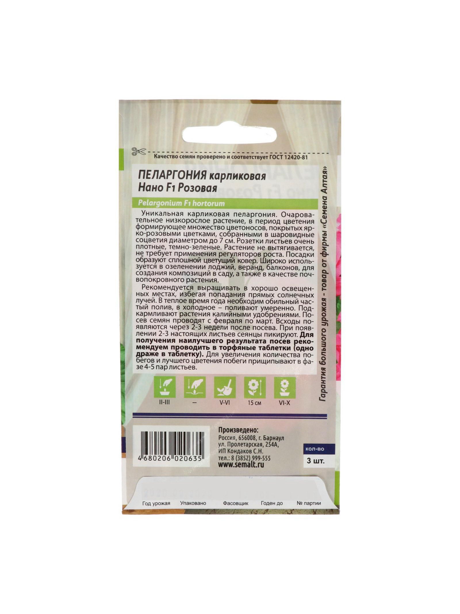 Семена цветов Пеларгония "Нано", ц/п, "Розовая", ц/п, 3 шт, Семена Алтая, Россия