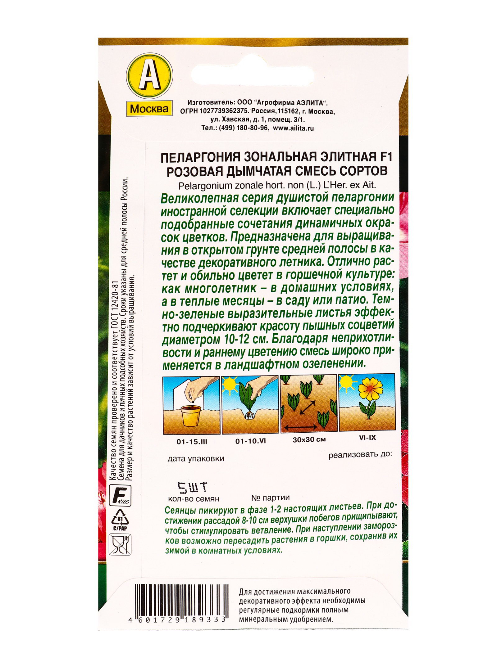 Семена цветов Пеларгония Элитная F1 розовая дымчатая, смесь сортов Мн Золотая серия, Ц/П,5 шт. 10945, Агрофирма АЭЛИТА, Индия