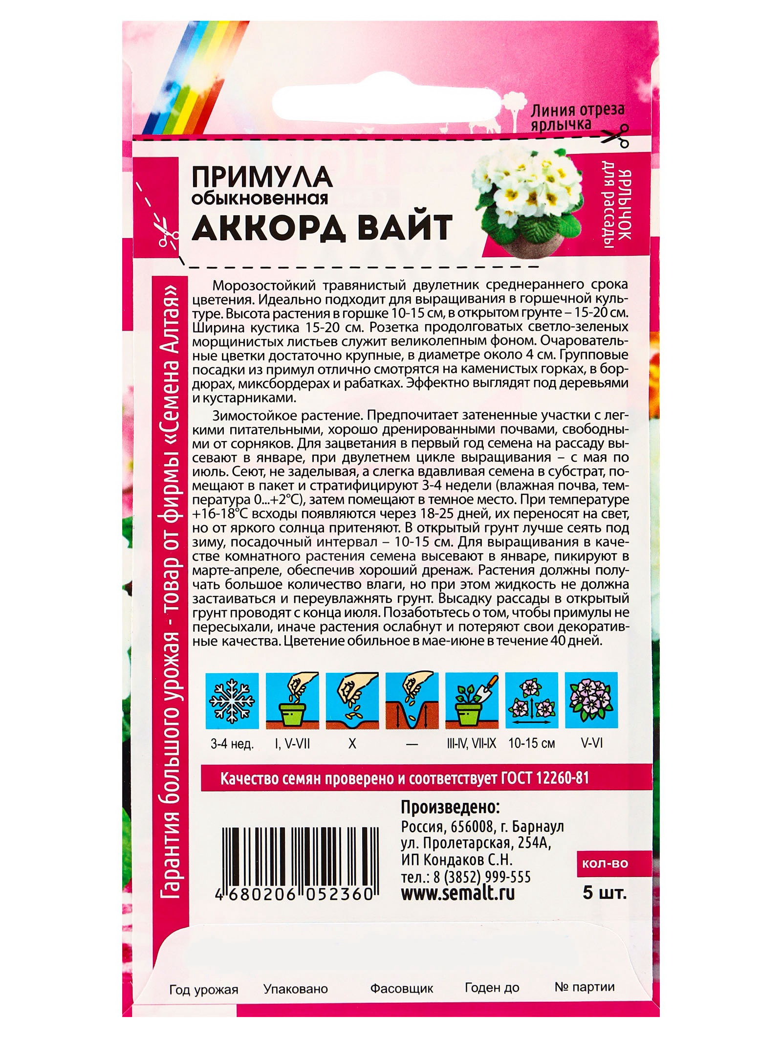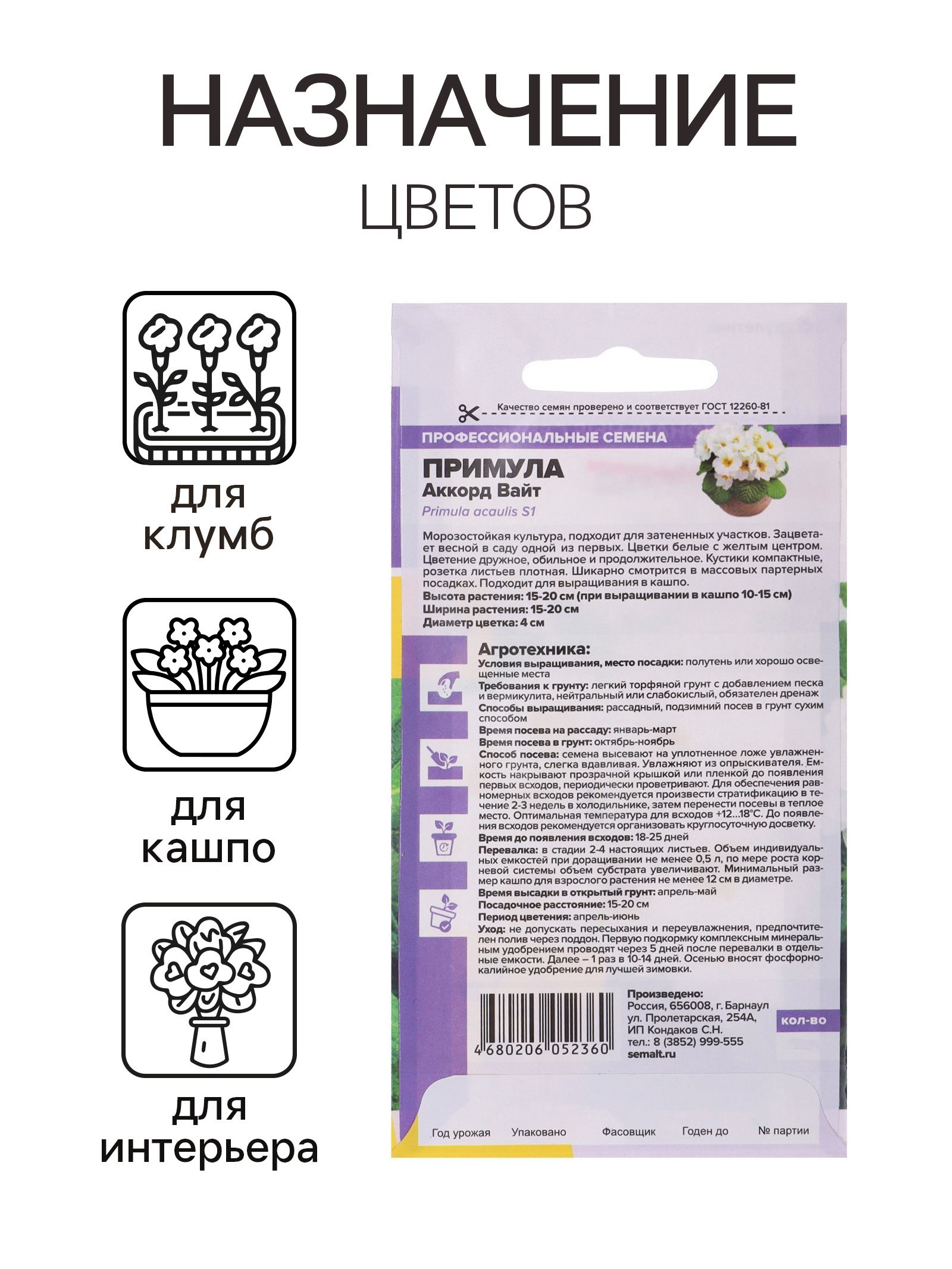 Семена Примула "Аккорд Вайт", ц/п, 5 шт, Семена Алтая, Россия