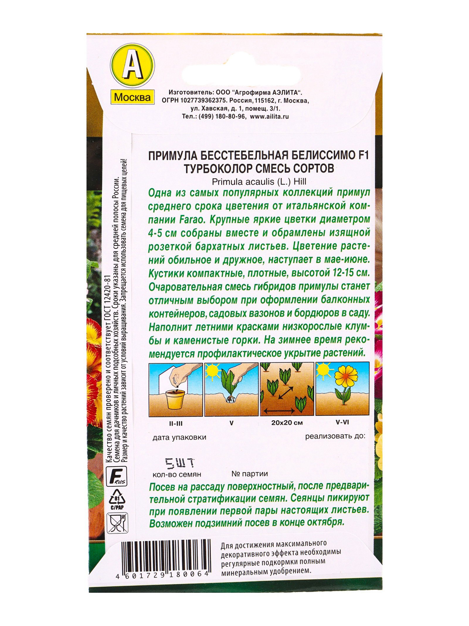Семена цветов Примула Белиссимо F1 турбоколор, смесь сортов Мн Золотая серия, Ц/П,5 шт., Агрофирма АЭЛИТА, Италия