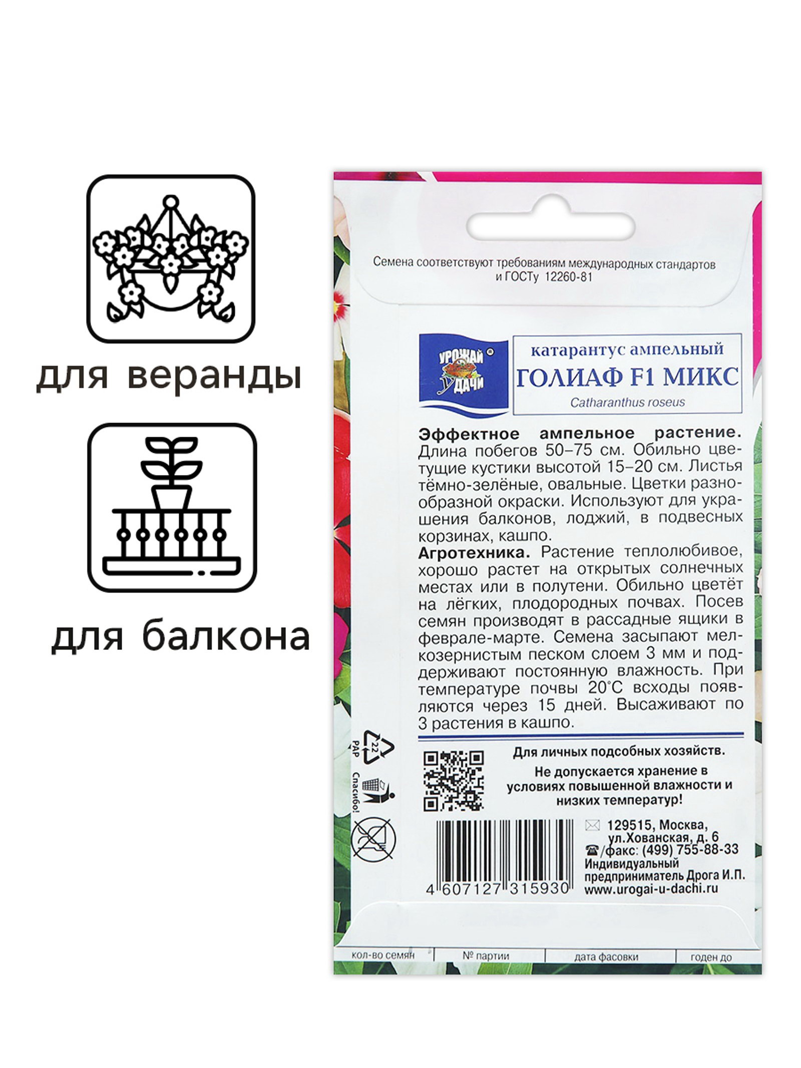Семена цветов Катарантус "ГОЛИАФ Микс", 0.01 г, "Урожай Удачи", УРОЖАЙ УДАЧИ, Россия
