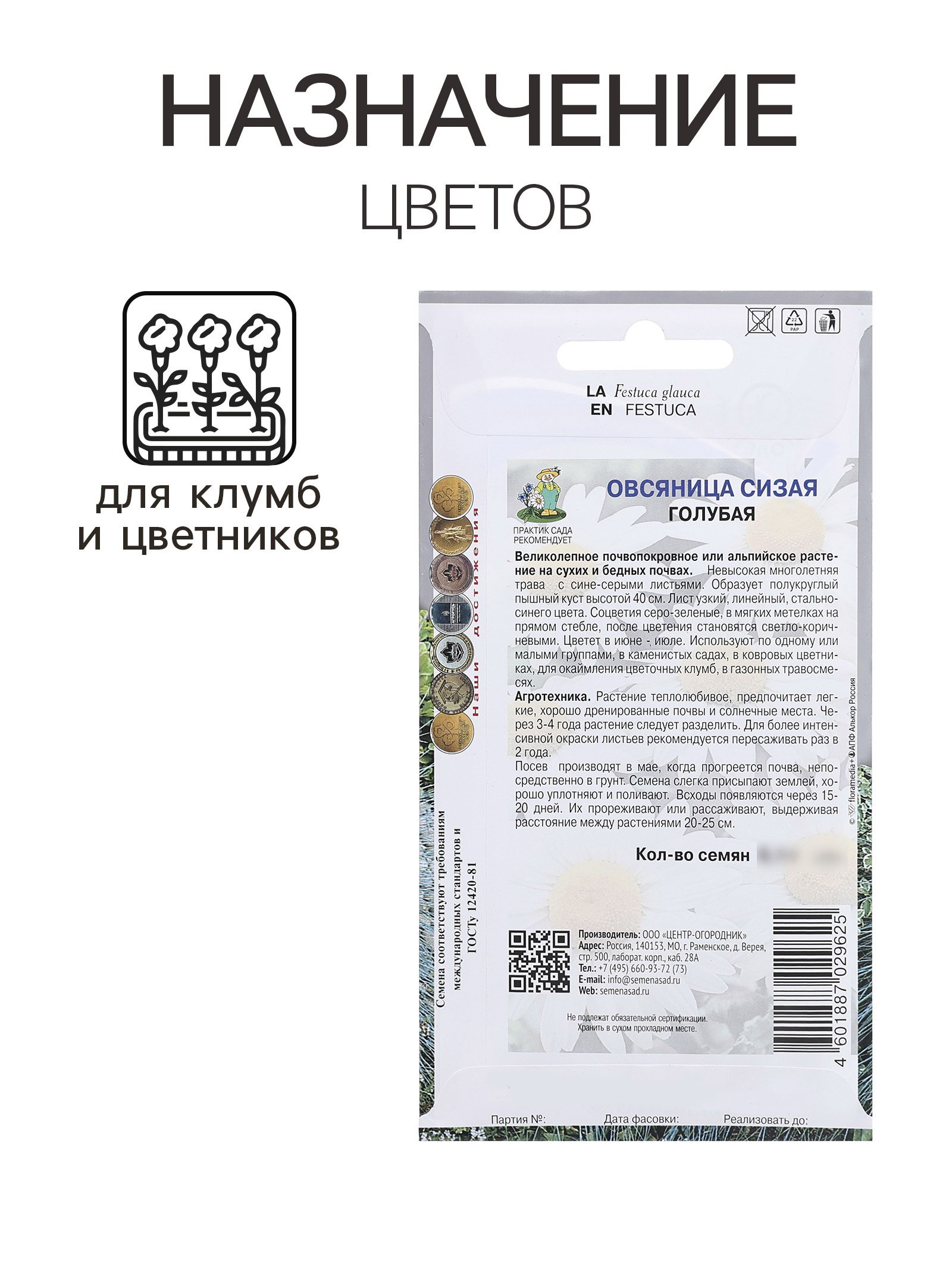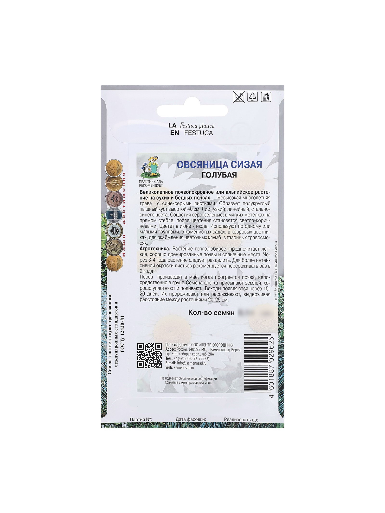 Размер упаковки: 8 x 0.1 x 15 см. Температурное ограничение: Нет Агрономический срок годности, лет: 3 Цвет: Голубой Особенности выращивания: Открытый грунт Махровые: Нет Сухоцвет: Нет По форме куста: Кустовая Назначение: Для создания цветников, клумбы Вегетация: Однолетники Отношение к свету: Рассеянный свет Разновидность: Цветущее Нуждаются ли в стратификации: Нет Нуждаются ли в стратификации: Нет tnved: 1209300000 Великолепное почвопокровное или альпийское растение на сухих и бедных почвах. Невысокая многолетняя трава с сине-серыми листьями. Образует полукруглый пышный куст высотой 40 см Лист узкий, линейный, стально-синего цвета. Соцветия серо-зеленые, в мягких метелках на прямом стебле, после цветения становятся светло-коричневыми. Цветет в июне - июле. Используют по одному или малыми группами, в каменистых садах, в ковровых цветниках, для окаймления цветочных клумб, в газонных травосмесях.Агротехника. Растение теплолюбивое, предпочитает легкие, хорошо дренированные почвы и солнечные места. Через 3-4 года растение следует разделить. Для более интенсивной окраски листьев рекомендуется пересаживать раз в 2 года. Посев производят в мае, когда прогреется почва, непосредственно в грунт. Семена слегка присыпают землей, хорошо уплотняют и поливают. Всходы появляются через 15-20 дней. Их прореживают или рассаживают, выдерживая расстояние между растениями 20-25 смСемена соответствуют требованиям международных стандартов и ГОСТу РФ 12420-81 | ||