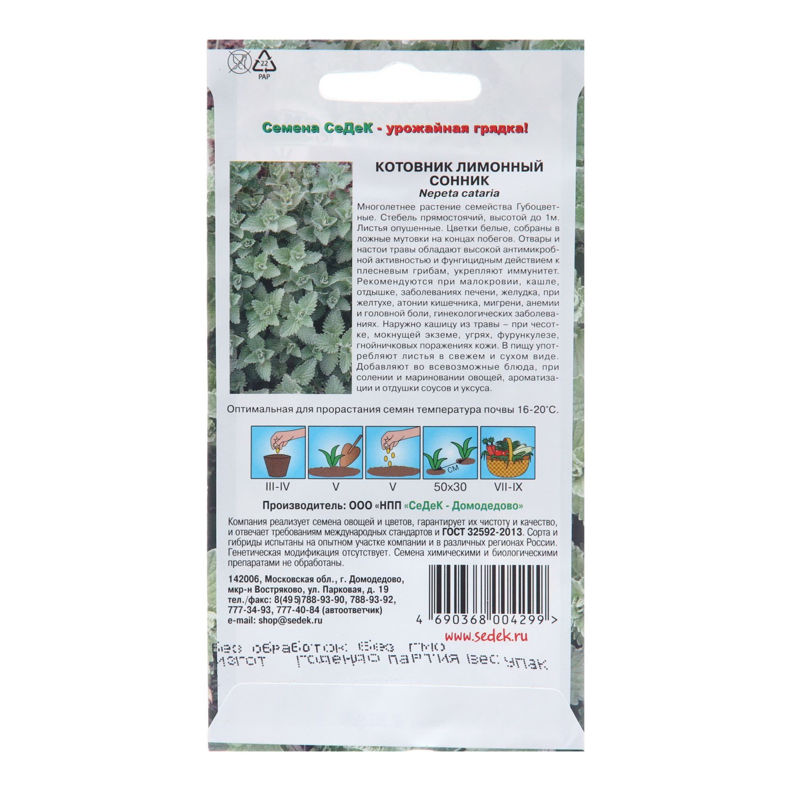 Цветение период: Август, Июль, Сентябрь Посев на рассаду: Апрель, Март Размер упаковки: 8 x 0.2 x 15 см. Температурное ограничение: Нет Махровые: Нет Сухоцвет: Нет Место выращивания: Открытый грунт Цвет: Зелёный Назначение: Для создания цветников, клумбы Вегетация: Однолетники По форме куста: Кустовая Отношение к свету: Светолюбивые Разновидность: Цветущее Сроки созревания: Средний Нуждаются ли в стратификации: Нет tnved: 1209999900 tnved: 1209999900 Посев (посадка) в грунт: Май Высота растений: 60-100 см Многолетнее растение семейства Губоцветные. Стебель прямостоячий, высотой до 1м. Листья опушенные. Цветки белые, собраны в ложные мутовки на концах побегов. Отвары и настои травы обладают высокой антимикробной активностью и фунгицидным действием к плесневым грибам, укрепляют иммунитет. Рекомендуются при малокровии, кашле, отдышке, заболеваниях печени, желудка, при желтухе, атонии кишечника, мигрени, анемии и головной боли, гинекологических заболеваниях. Наружно кашицу из травы – при чесотке, мокнущей экземе, угрях, фурункулезе, гнойничковых поражениях кожи. В пищу употребляют листья в свежем и сухом виде. Добавляют во всевозможные блюда, при солении и мариновании овощей, ароматизации и отдушки соусов и уксуса. | ||