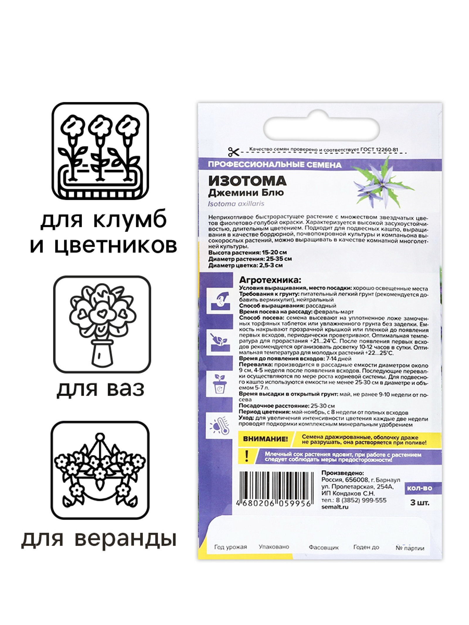 Семена цветов Изотома Джемини Блю, ц/п, 3 шт., Семена Алтая, Россия