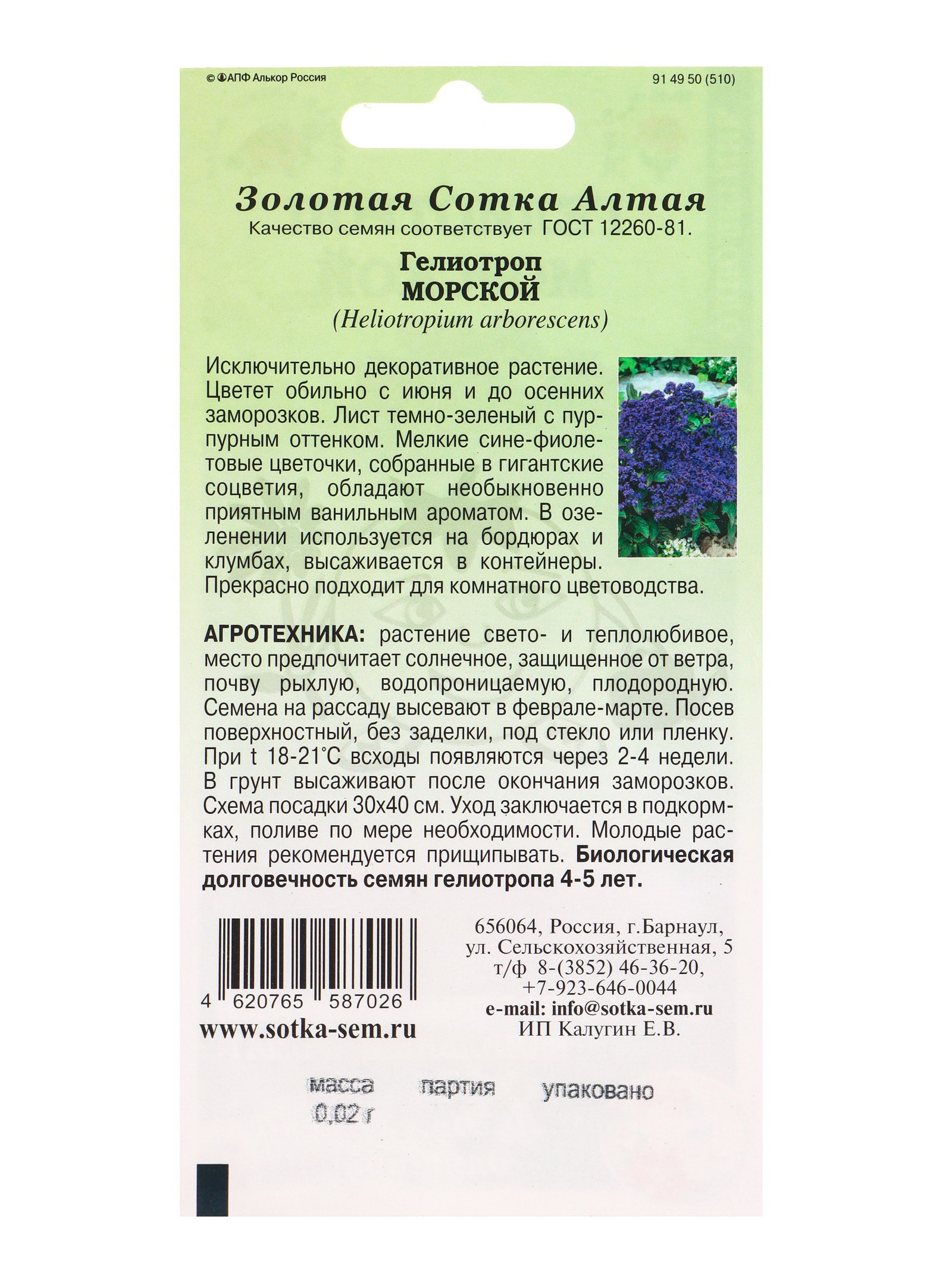Семена Гелиотроп Морской /Сотка/ 0.02 г/*1800, Золотая Сотка Алтая, Россия