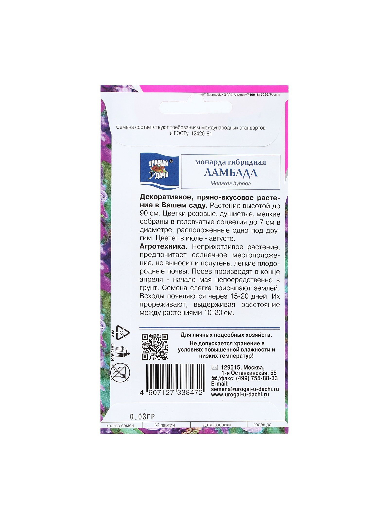 Набор семян Монарда гибридная "Ламбада", 5 шт., 9x17x1 см., Мой выбор, Россия
