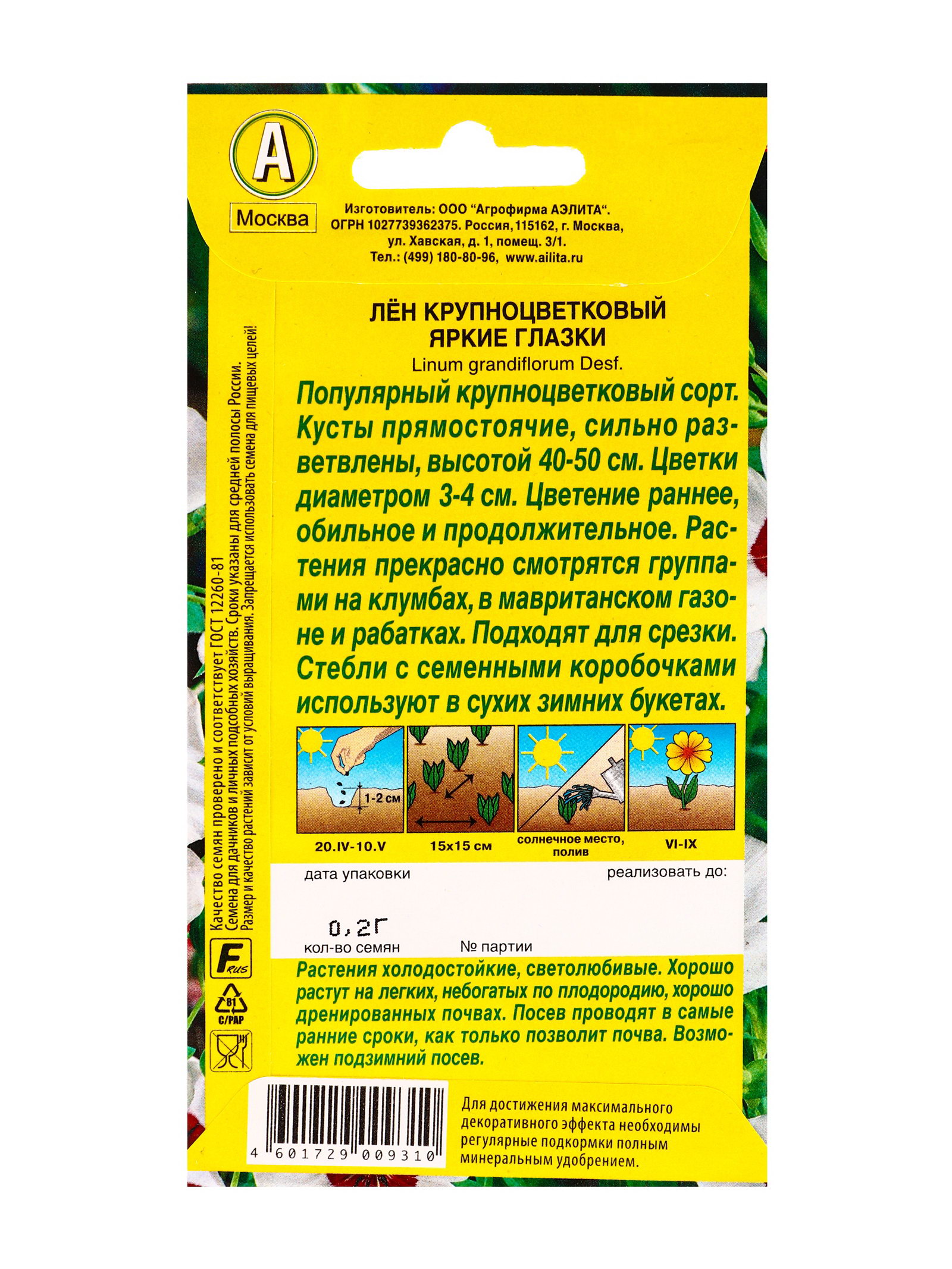 Семена цветов Лен крупноцветковый Яркие глазки, Ц/П,0.2 г, Агрофирма АЭЛИТА, Нидерланды