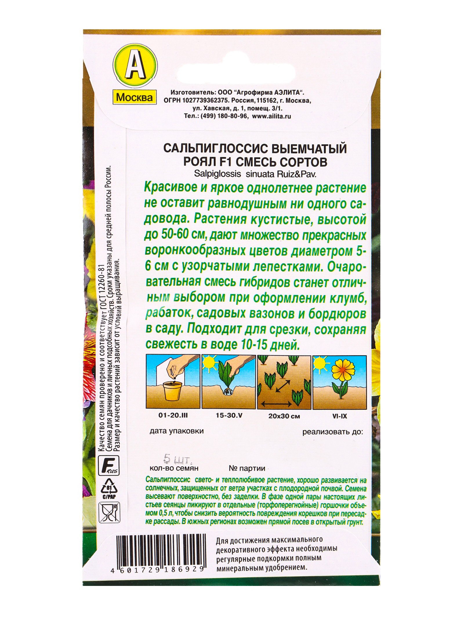 Семена цветов Сальпиглоссис Роял F1, смесь сортов Золотая серия, Ц/П,5 шт., Агрофирма АЭЛИТА, Чили