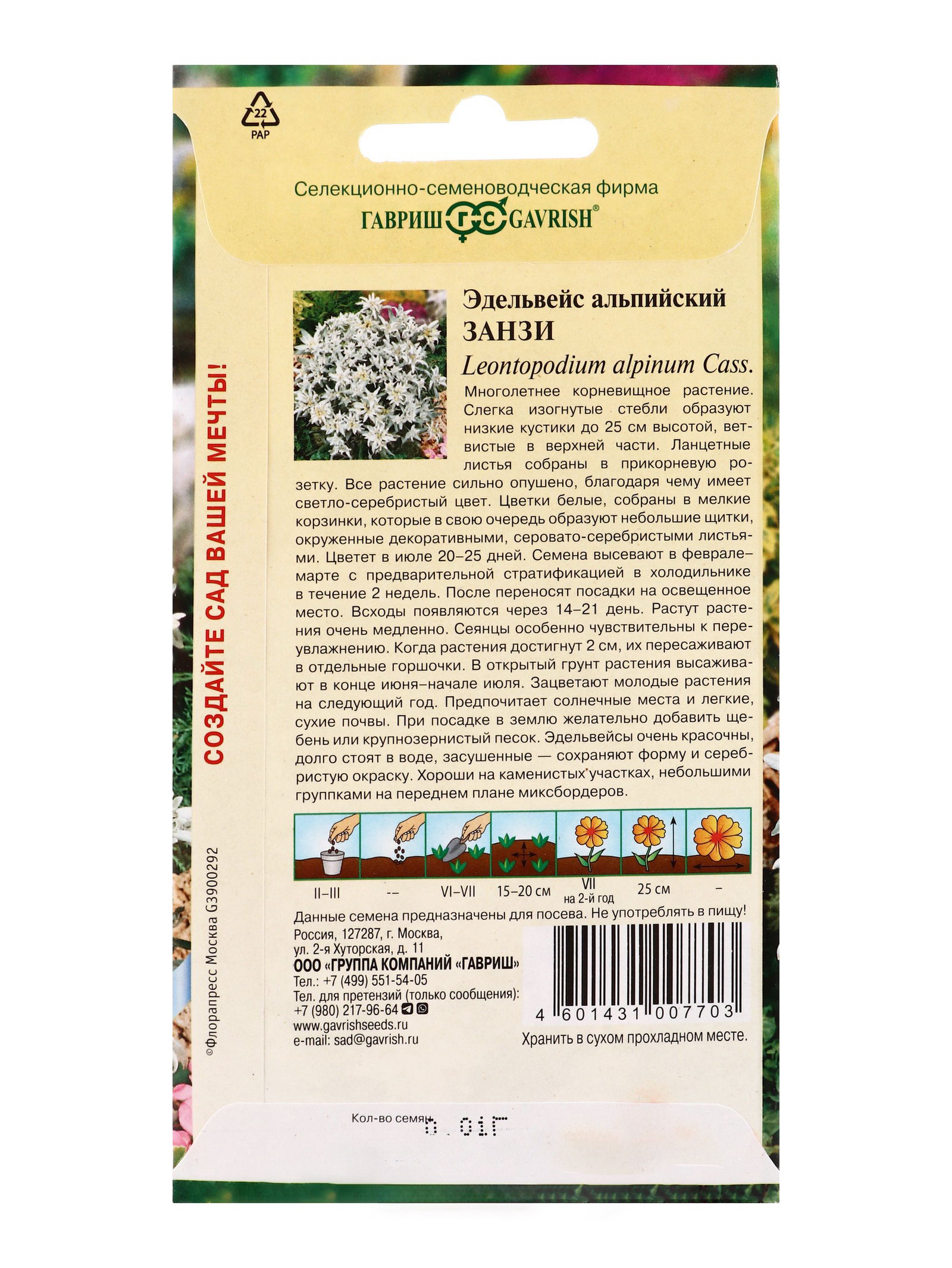 Семена цветов Эдельвейс альпийский Занзи* 0.01 г серия Альпийская горка, Гавриш, Россия
