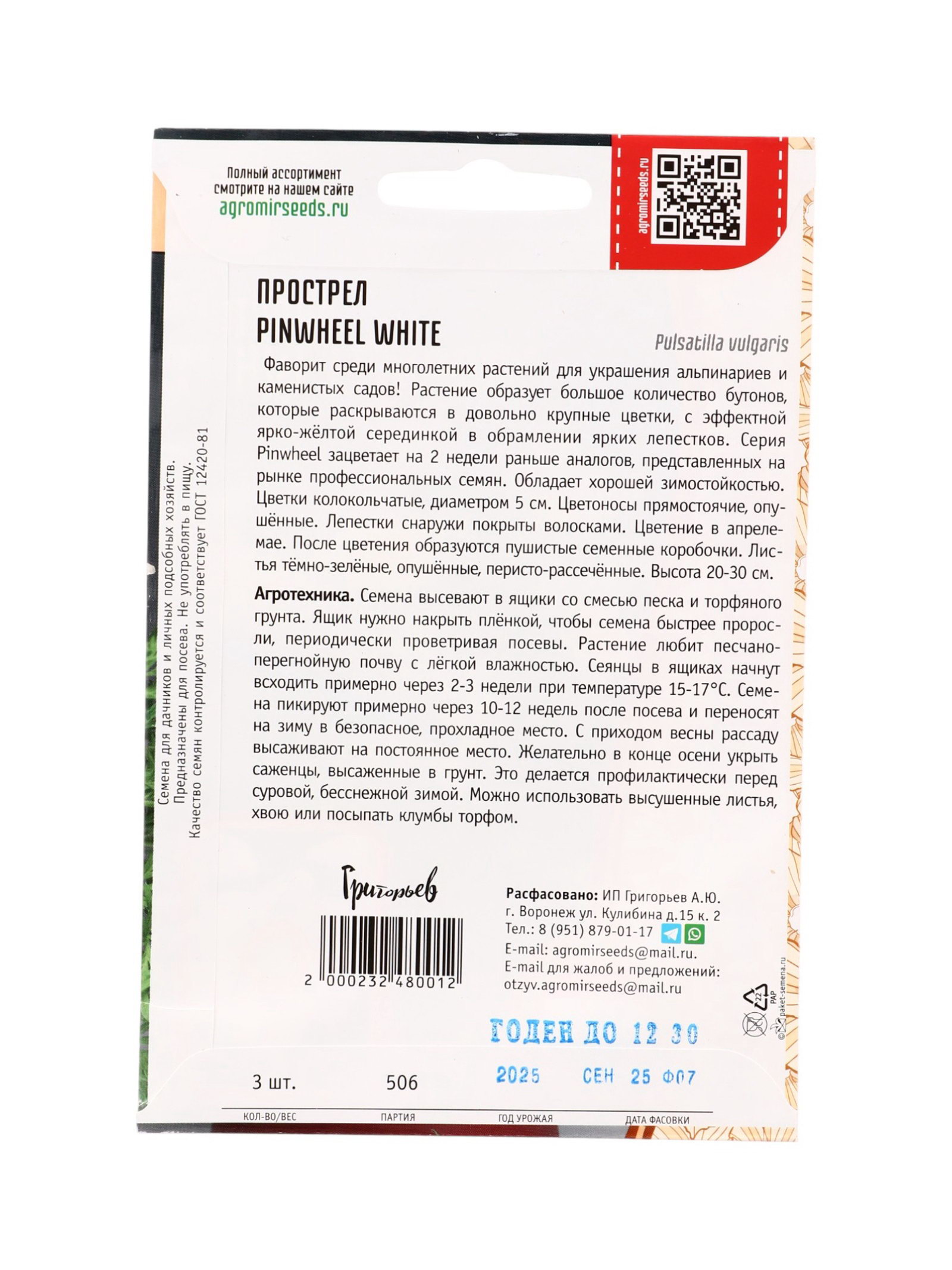 Семена цветов Прострел Pinwheel White 3 шт. 12.29 гр, Григорьев, Россия
