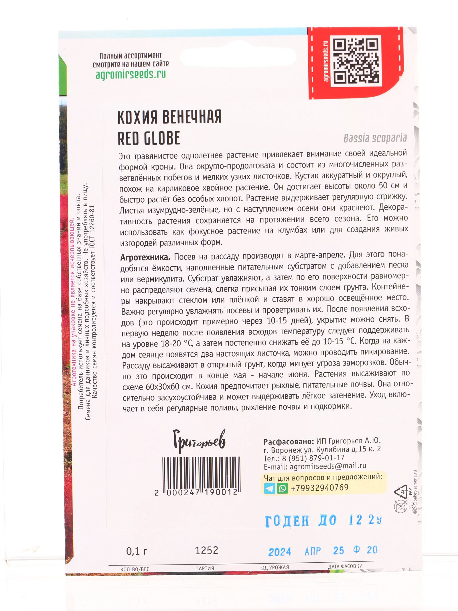 Семена цветов Кохия Red Globe венечная 0.1 гр 12.29 гр, Григорьев, Россия