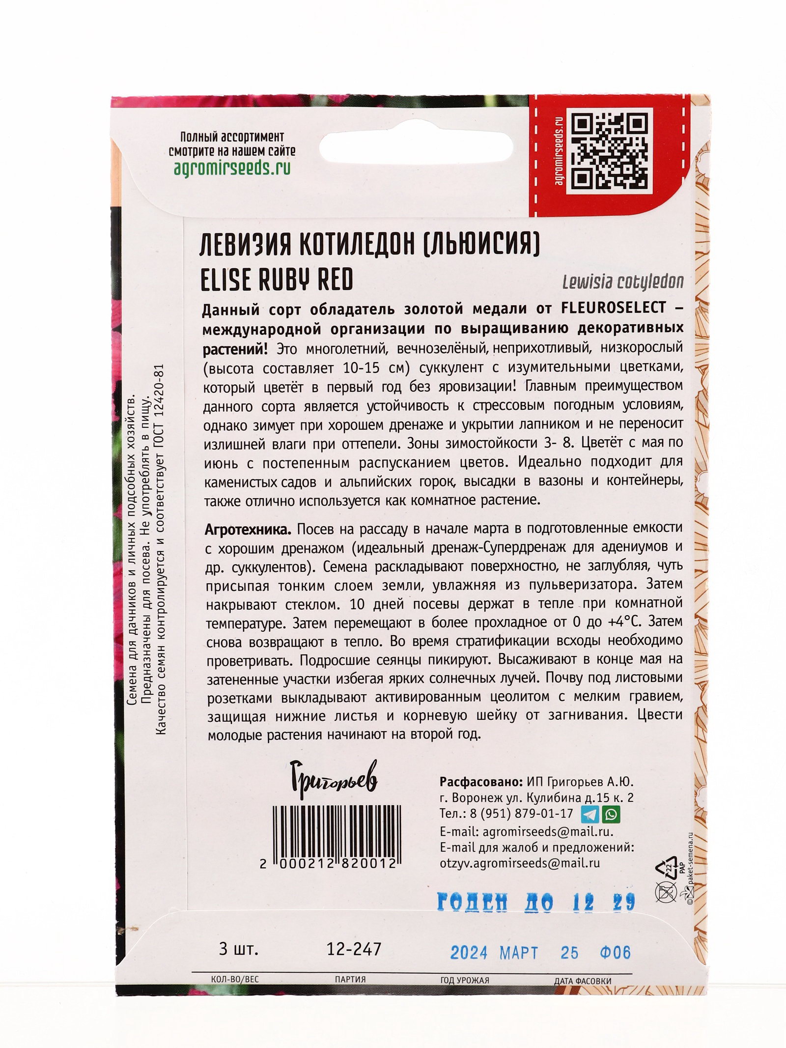 Семена цветов Левизия Elise Ruby Red котиледон 3 шт. 12.29 гр, Григорьев, Россия