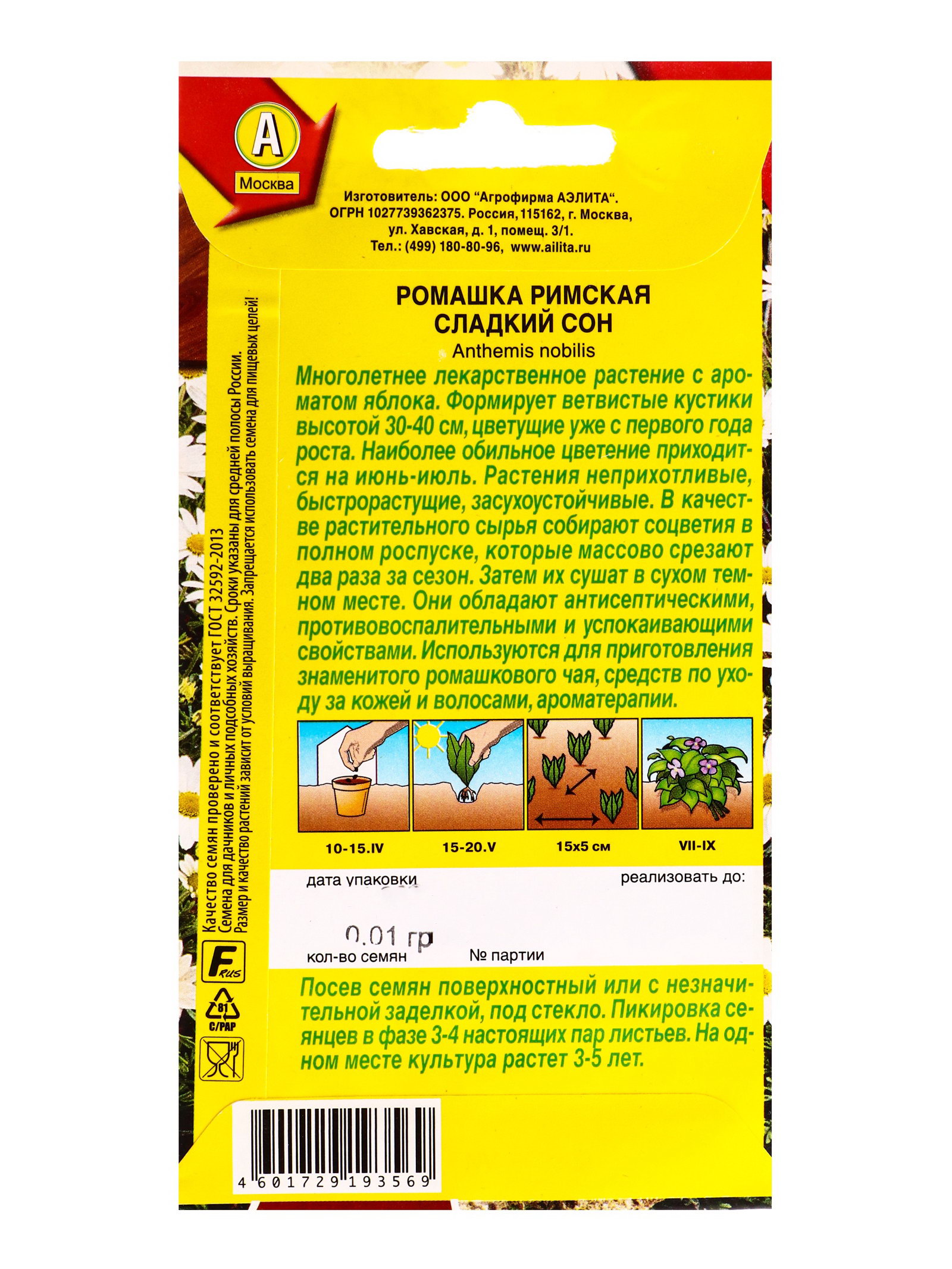 Семена Ромашка римская Сладкий сон Лечебный огород, Ц/П,0.01 г, Агрофирма АЭЛИТА, Россия