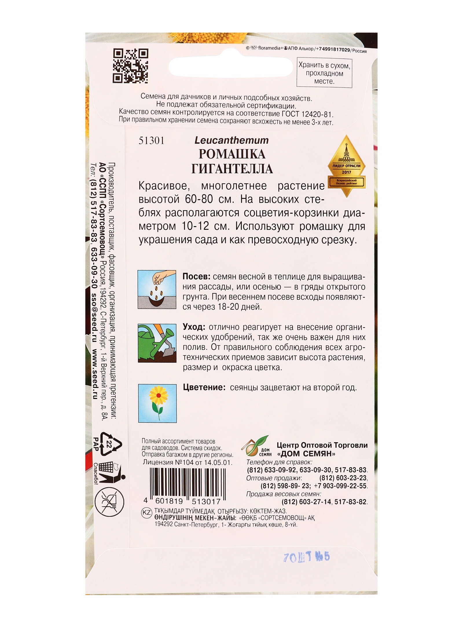 Посев на рассаду: Апрель, Март Место выращивания: Закрытый грунт (теплицы, укрытия), Открытый грунт Цветение период: Август, Июль, Июнь, Сентябрь Посев (посадка) в грунт: Июнь, Май Цвет: Белый, Жёлтый Размер упаковки: 8 x 0.3 x 15 см. tnved: 1209999900 Запрет реализации по сегментам: 00000000578 Вид: Ромашка Вегетация: Многолетники Сухоцвет: Нет Махровые: Нет Нуждаются ли в стратификации: Нет Назначение: Для создания цветников, клумбы Высота растений: 60-100 см Отношение к свету: Светолюбивые По форме куста: Кустовая Нивяник (садовая ромашка) "Гигантелла" - это многолетнее растение с крупными, выразительными соцветиями. Огромные белые корзинки с ярко-желтой сердцевиной на высоких, прочных цветоносах станут настоящим украшением любого цветника, наполняя сад атмосферой свежести и радости с июня до сентября.