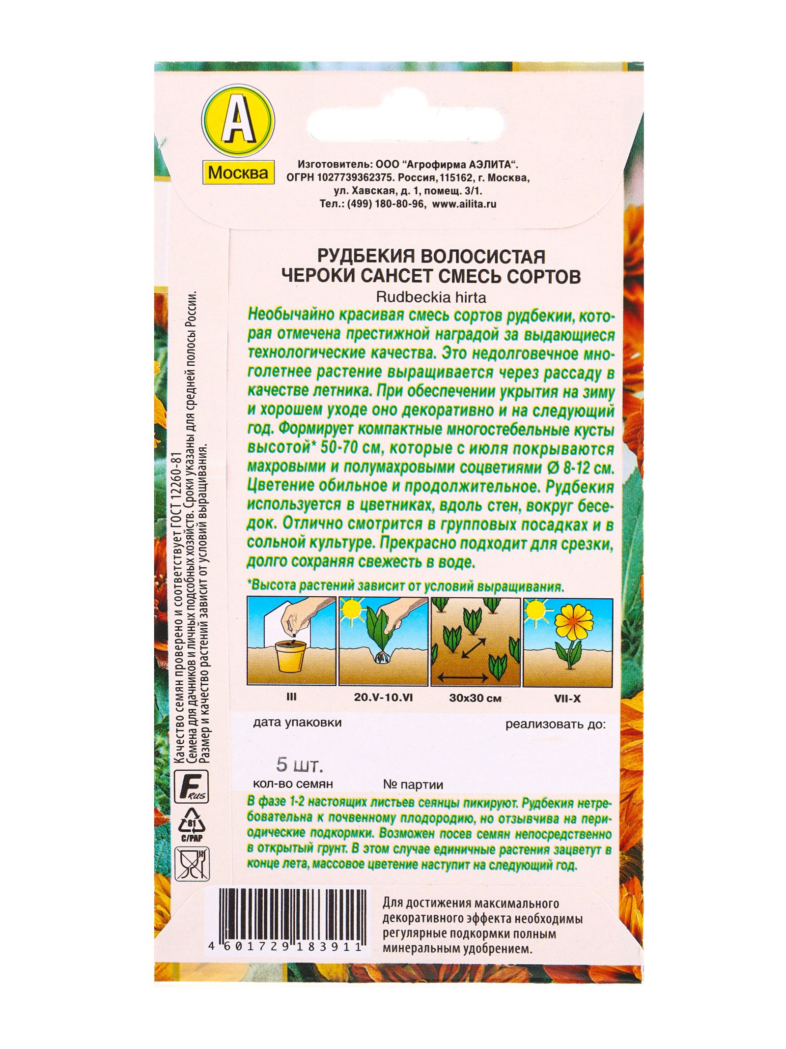 Семена цветов Рудбекия Чероки сансет, смесь сортов Победитель.Выбор экспертов, Ц/П,5 шт., Агрофирма АЭЛИТА, Польша