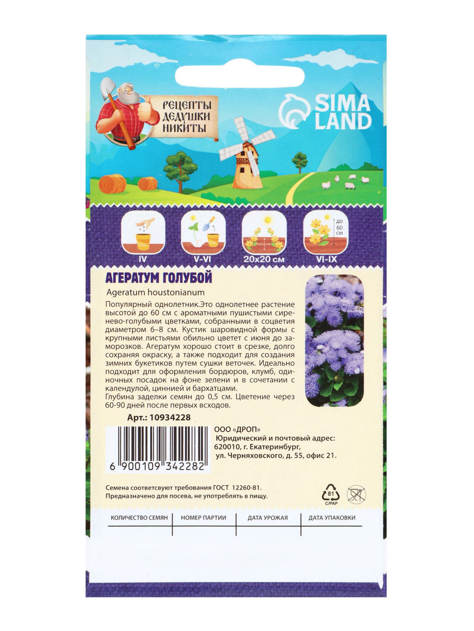 Семена цветов Агератум, голубой, 0.1 г, 10x17x1 см., Рецепты дедушки Никиты, Россия