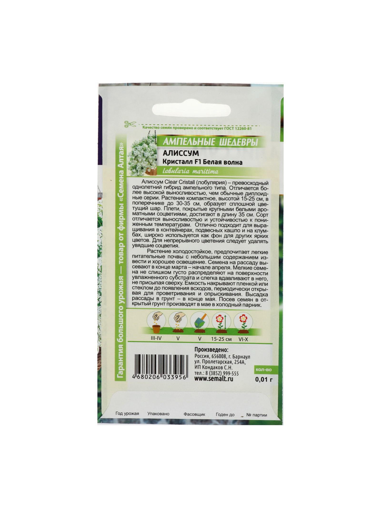 Семена цветов Алиссум Кристалл "Белая Волна", ц/п, F1, ампельный, 0.01 г, Семена Алтая, Россия