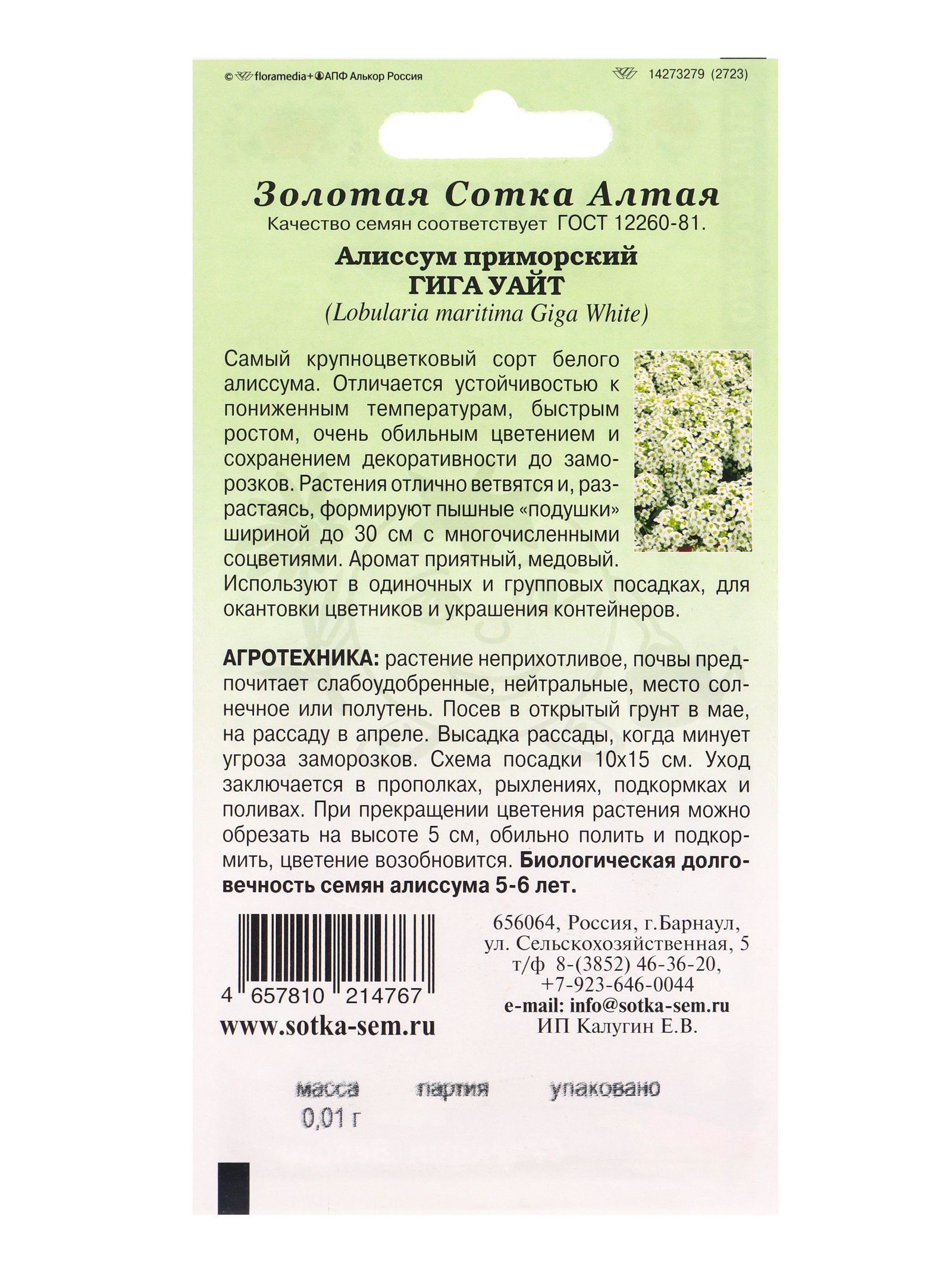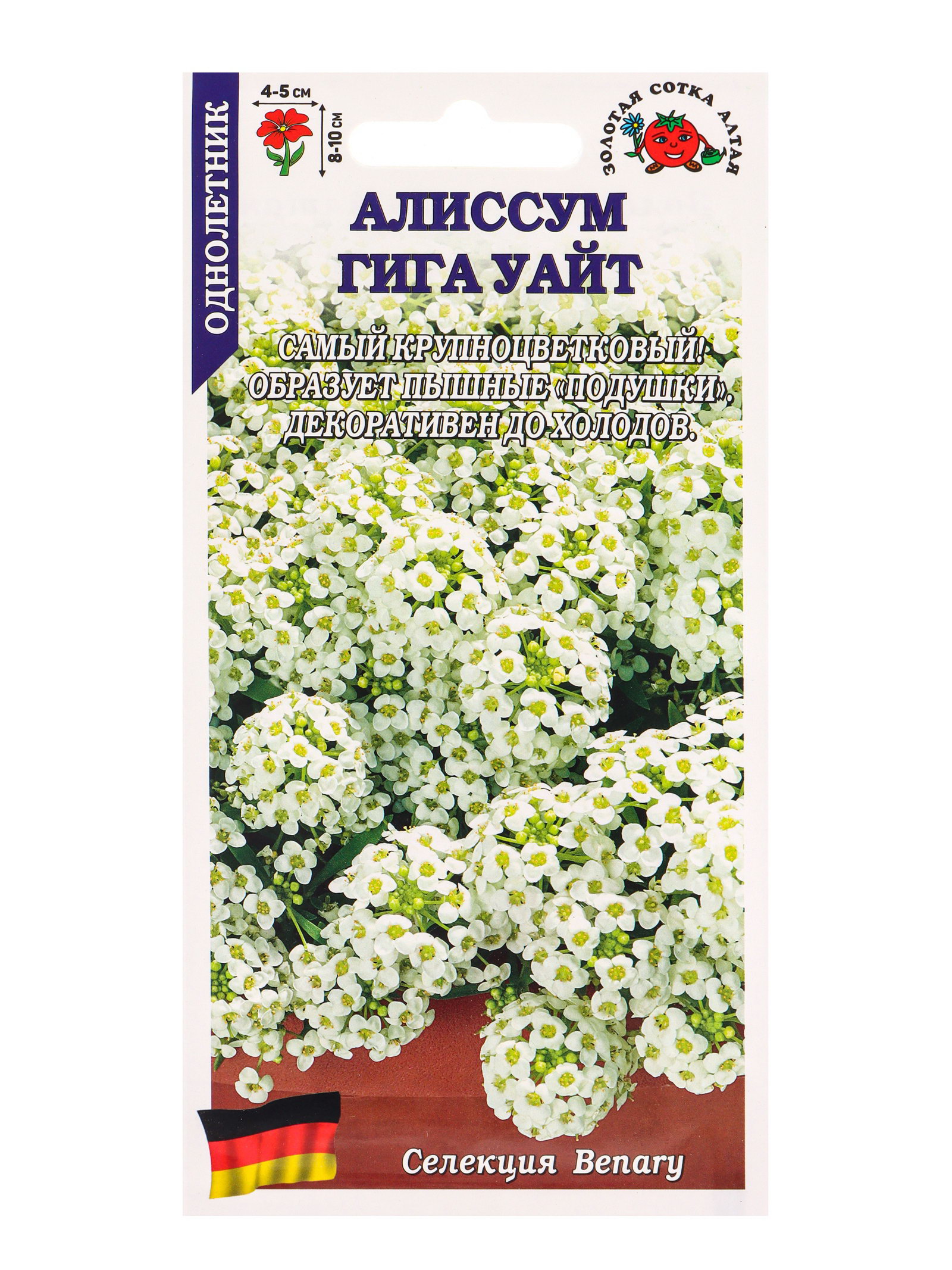 Семена Алиссум Гига Уайт /Сотка/ 0.01 г/*1800, Золотая Сотка Алтая, Россия