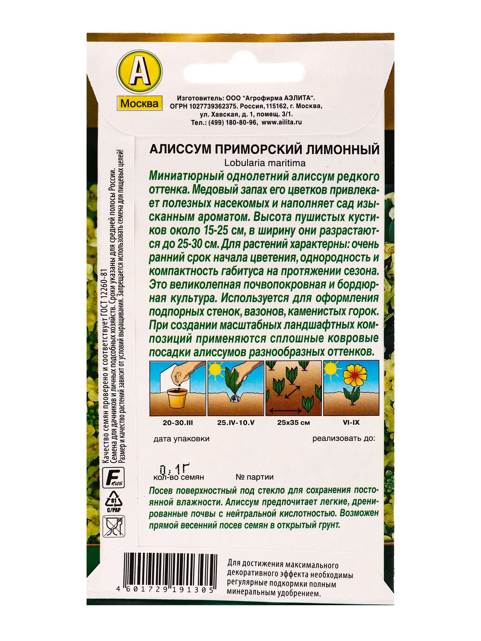 Семена цветов Алиссум приморский Лимонный Золотая серия, Ц/П,0.1 г, Агрофирма АЭЛИТА, Россия