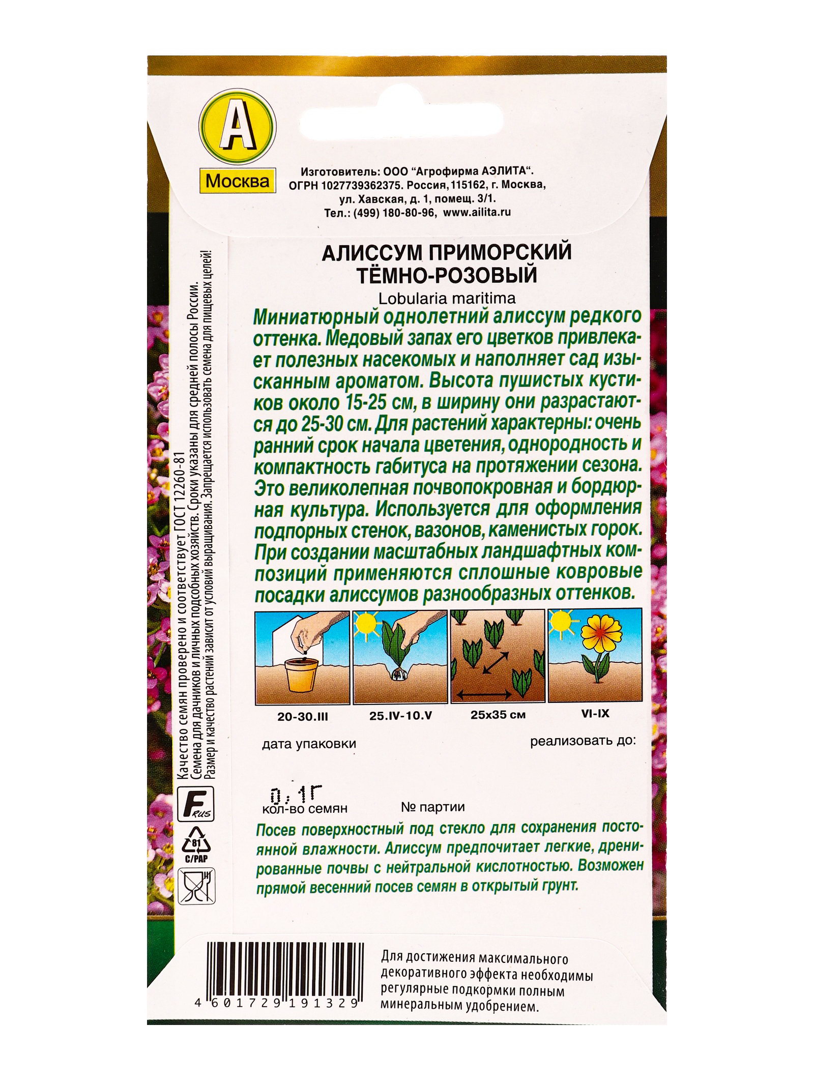 Семена цветов Алиссум приморский Тёмно-розовый Золотая серия, Ц/П,0.1 г, Агрофирма АЭЛИТА, Россия
