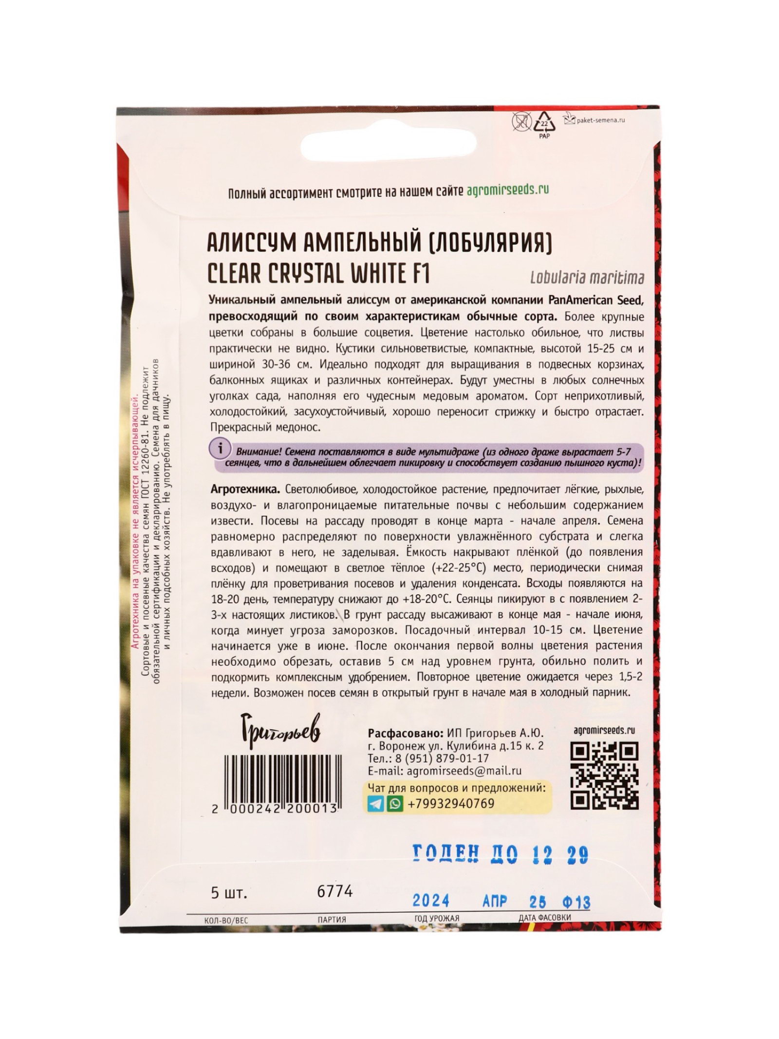 Семена цветов Алиссум Чистый Кристалл White F1, Григорьев, Россия