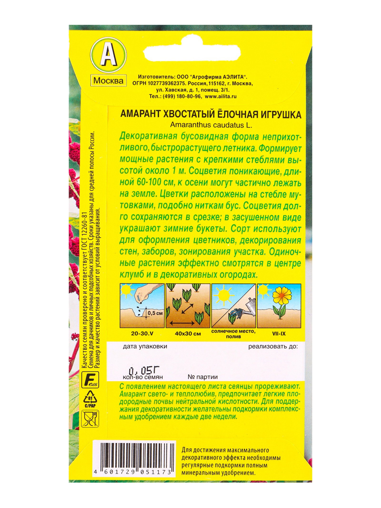 Семена цветов Амарант Елочная игрушка, Ц/П,0.05 г, Агрофирма АЭЛИТА, Нидерланды
