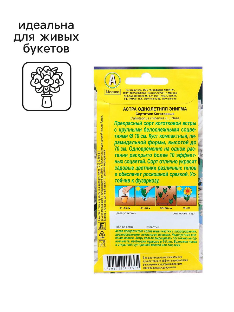 По форме куста: Ампельная, Кустовая Посев на рассаду: Апрель, Март Посев (посадка) в грунт: Июнь, Май Вид: Астра, Семечки Цветение период: Август, Июль, Июнь, Сентябрь Размер упаковки: 8 x 0.3 x 15 см. Сухоцвет: Нет Место выращивания: Открытый грунт Махровые: Да Назначение: Для создания цветников, клумбы Вегетация: Однолетники Разновидность: Цветущее Отношение к свету: Светолюбивые Нуждаются ли в стратификации: Нет tnved: 1209999900 tnved: 1209999900 Температурное ограничение: Нет Цвет: Белый "Прекрасный сорт среднего срока цветения. Принадлежит к сравнительно новому сортотипу коготковых астр. Образует узкий пирамидальный куст-букет высотой до 80 см Одновременно на кусте раскрыты более 10 оригинальных густомахровых соцветий диаметром до 10 см, с красиво уложенными лепестками. Сорт универсального назначения– отлично украшает цветники и дает ценную срезку. Устойчив к фузариозу. Посев. Выращивают рассадным способом. С развитием первой пары настоящих листочков сеянцы пикируют. На постоянное место рассаду высаживают в возрасте30-35 дней. Возможен посев семян в открытый грунт весной или под зиму, в конце октября, на глубину 0,5-1 см Растениям необходимы регулярные поливы, прополки, рыхления и подкормки." | ||