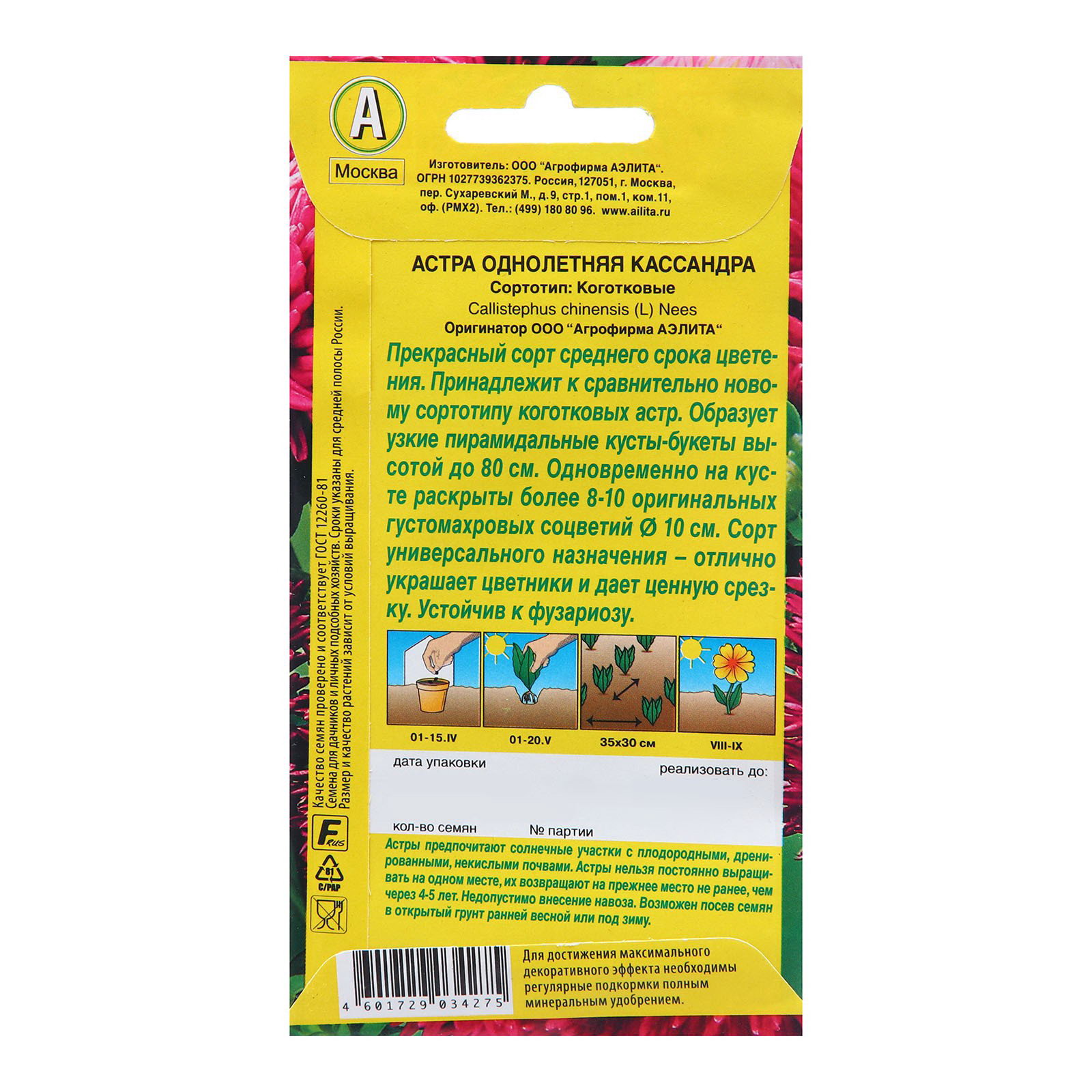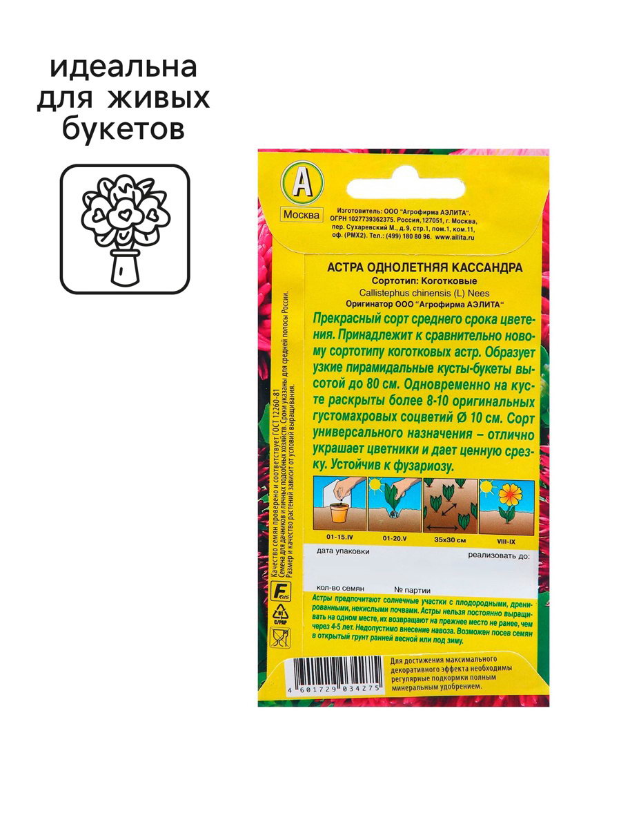 Семена Астра Кассандра Ор. А Одн Ц/П 0.2г, Агрофирма АЭЛИТА, Нидерланды