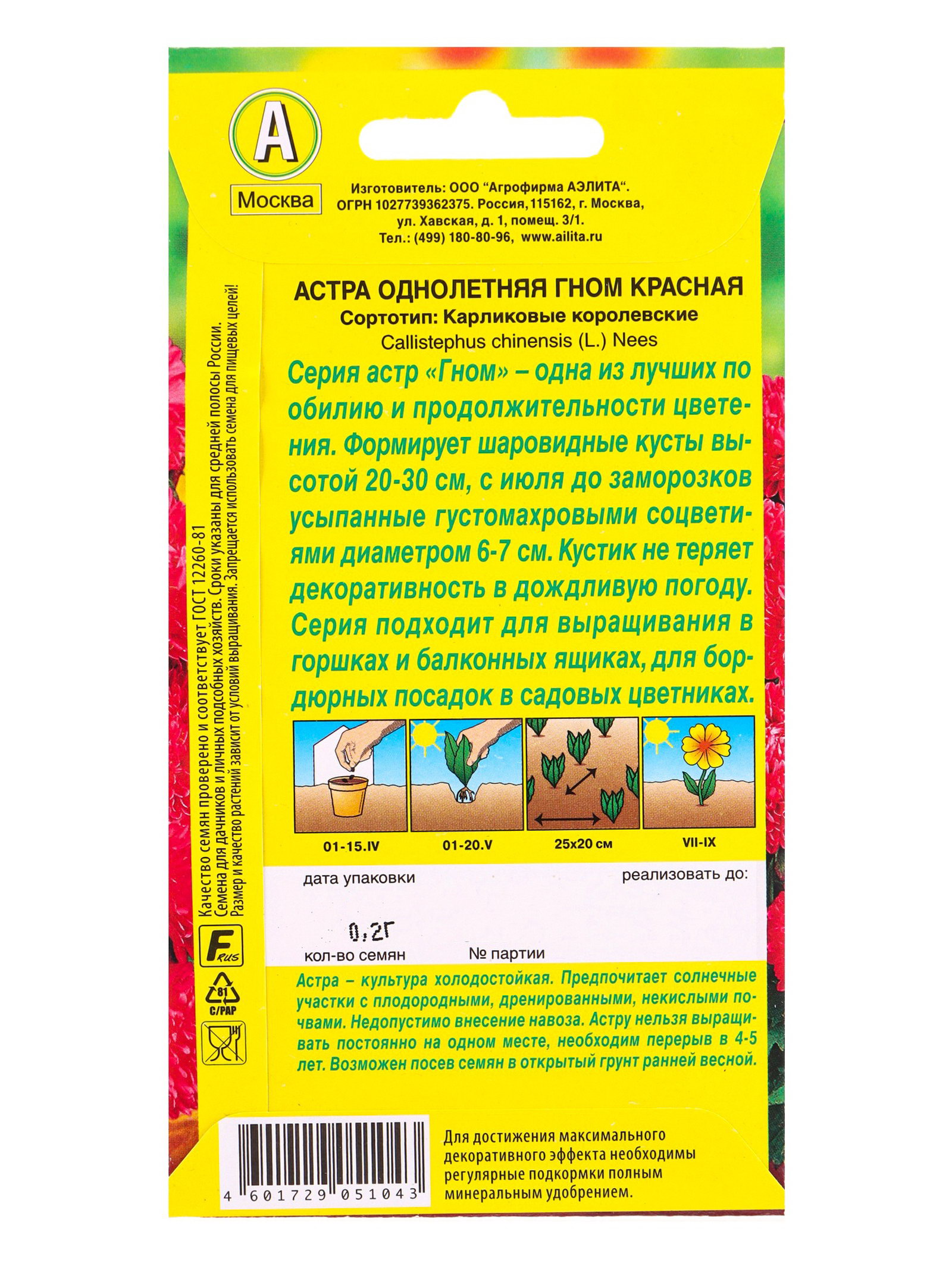 Семена цветов Астра Гном красная, Ц/П,0.2 г, Агрофирма АЭЛИТА, Нидерланды