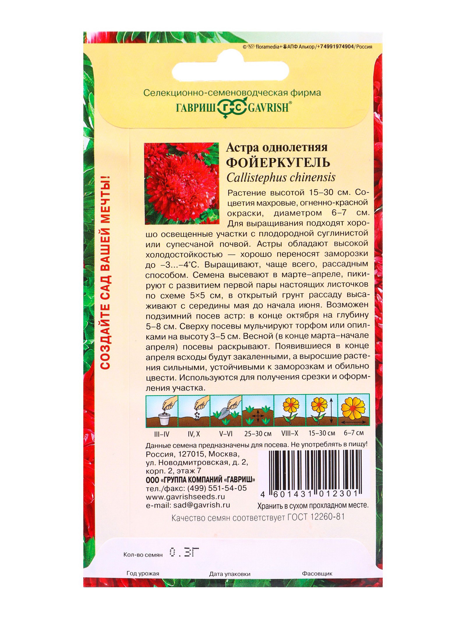 Цветение период: Август, Октябрь, Сентябрь Размер упаковки: 8 x 0.1 x 15 см. tnved: 1209918000 Температурное ограничение: Нет Разновидность: Цветущее Место выращивания: Открытый грунт Высота растений: До 30 см По форме куста: Кустовая Отношение к свету: Светолюбивые Назначение: Для создания цветников, клумбы Цвет: Красный Махровые: Да Вегетация: Однолетники Вид: Астра Сухоцвет: Нет | ||