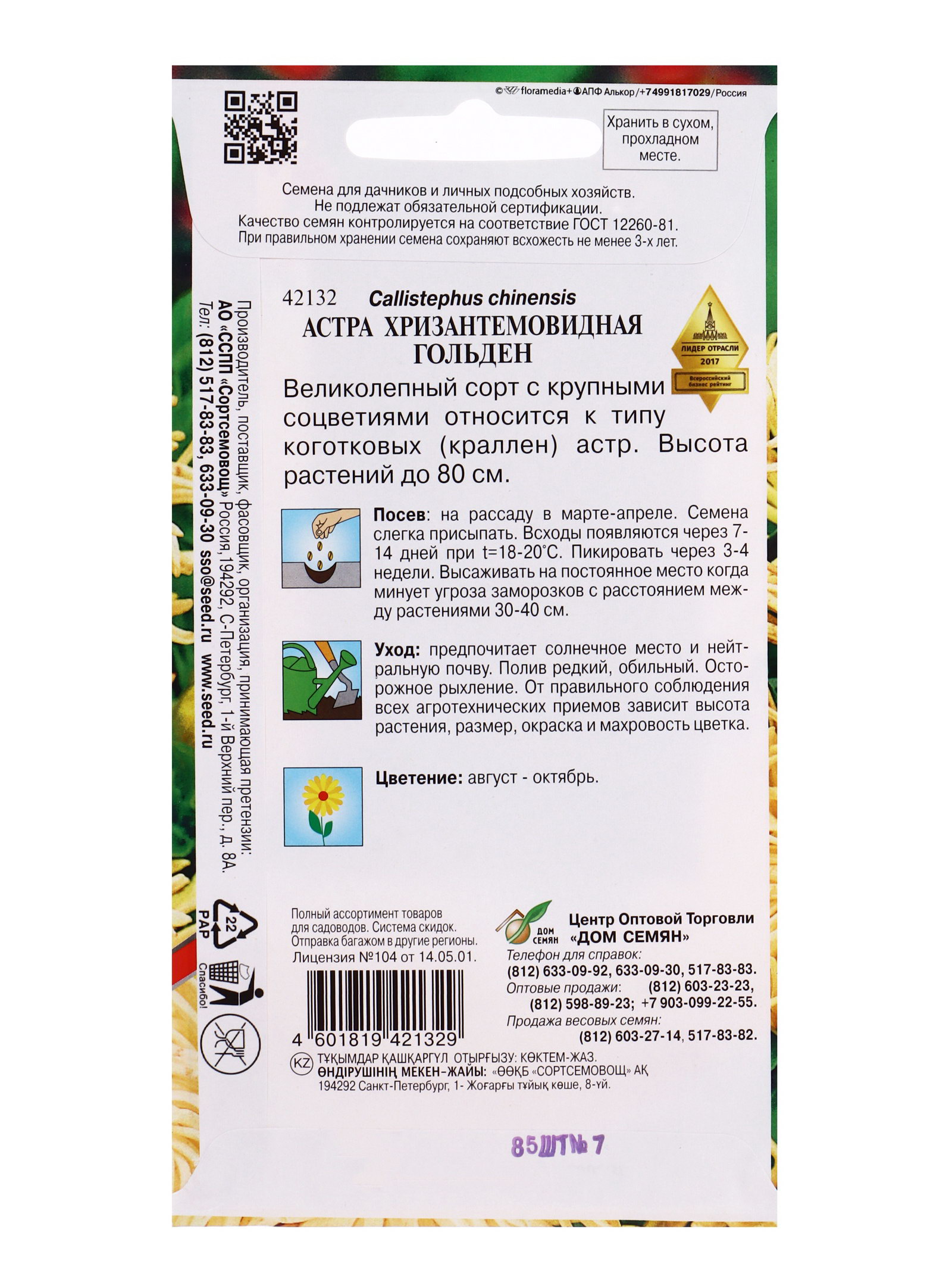 Семена цветов Астра хризантемовидная Гольден 85 шт., Дом семян, Россия