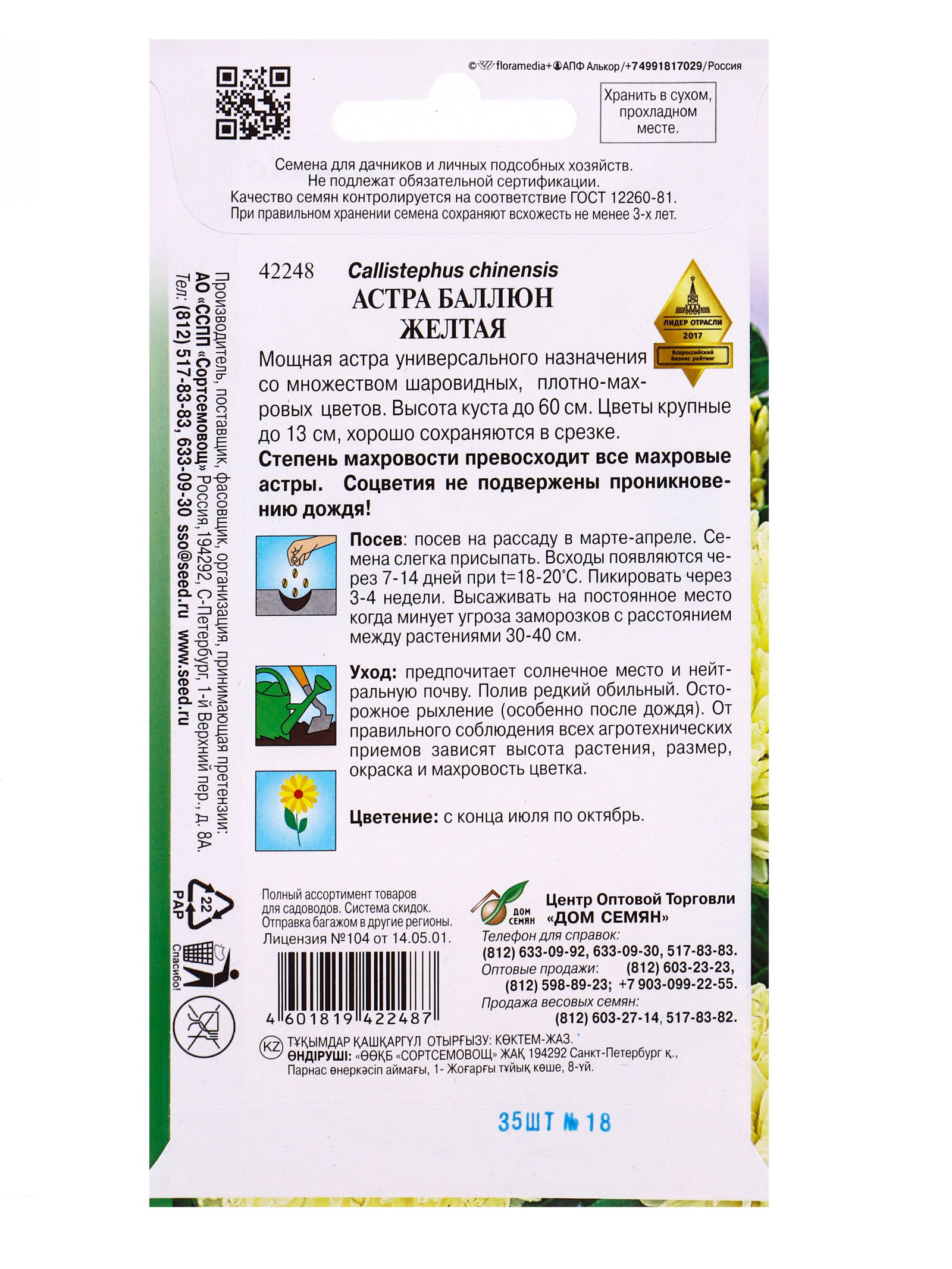Семена цветов Астра Баллюн жёлтая 35 шт., Дом семян, Россия