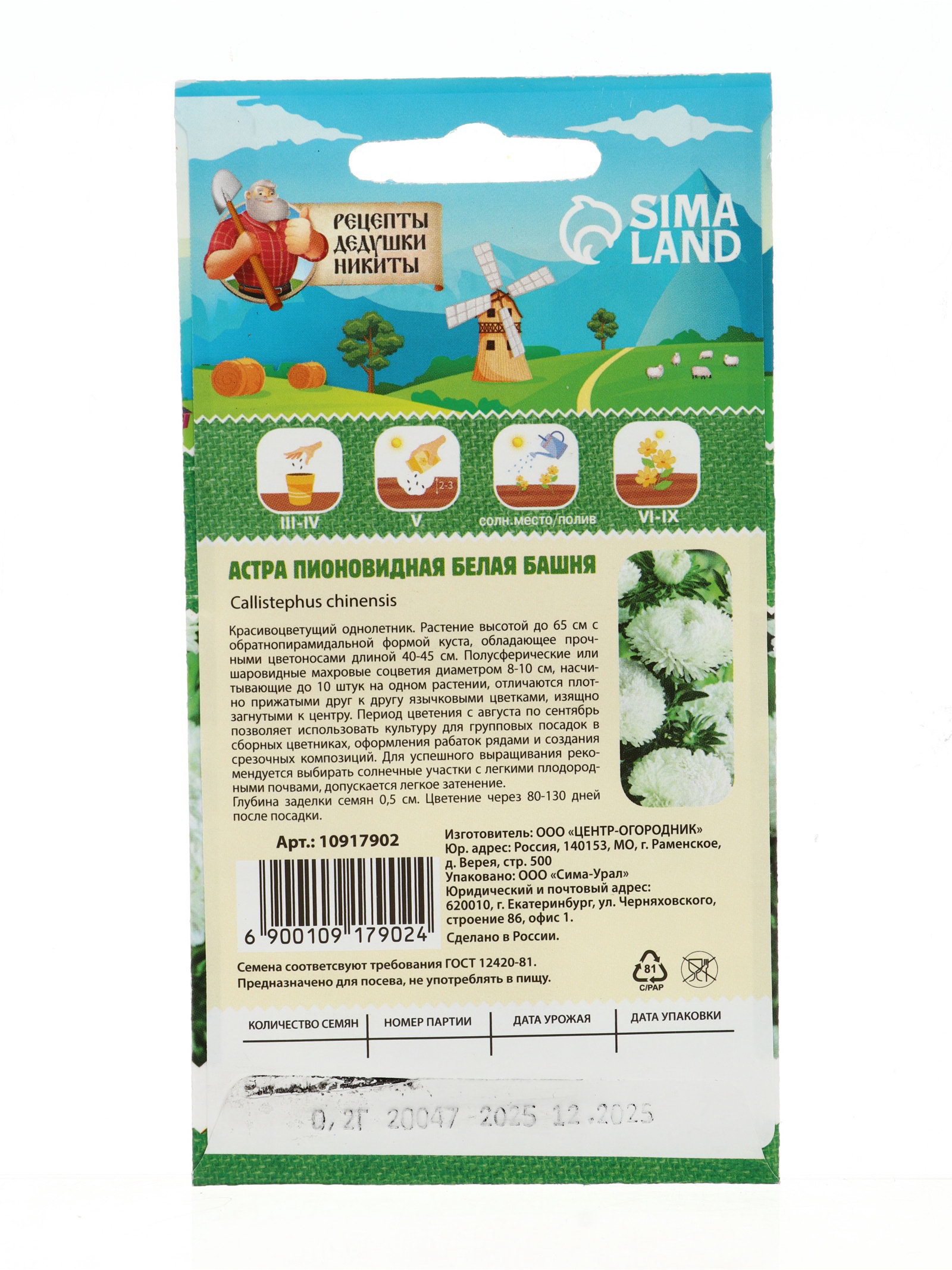 Семена цветов Астра пионовидная "Белая башня", 0.2 г, 7x15x1 см., Рецепты дедушки Никиты, Россия