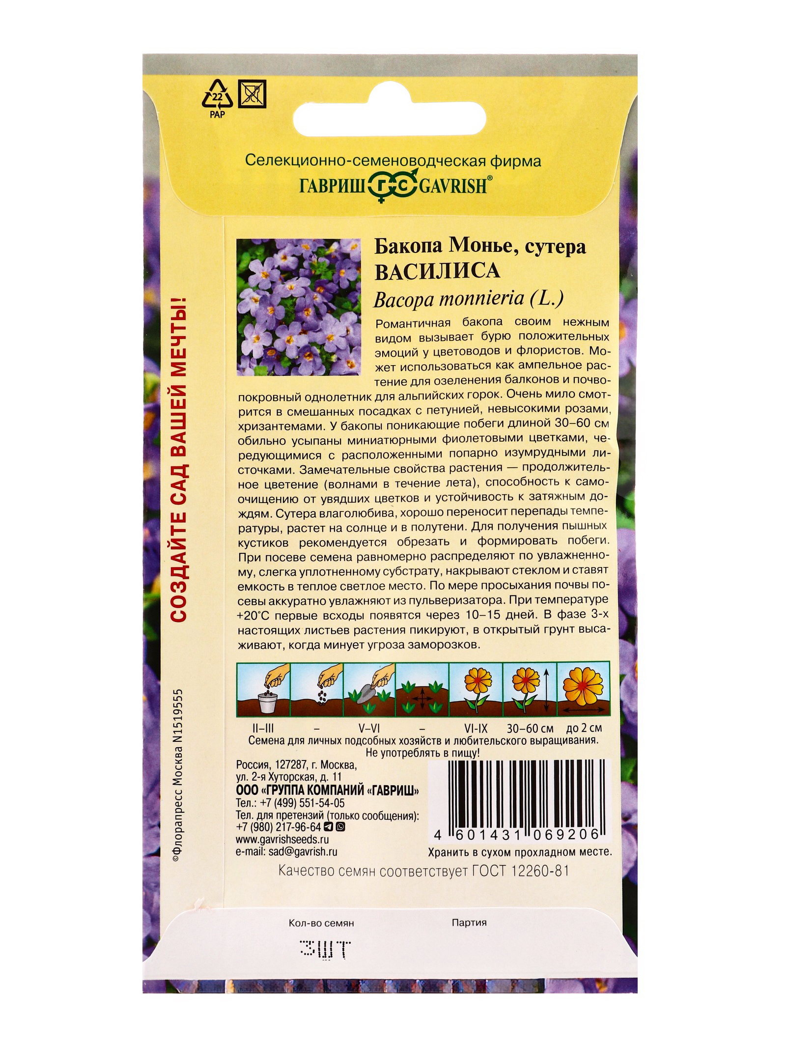 Семена цветов Бакопа Василиса 3 шт. гранул. пробирка, Гавриш, Россия