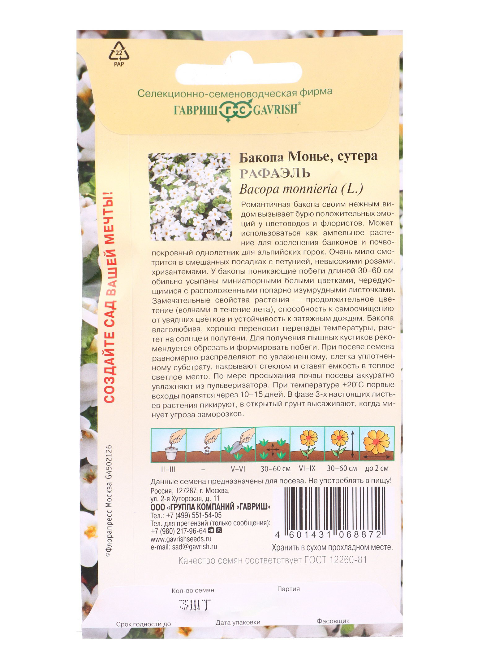 Семена цветов Бакопа Рафаэль 3 шт. гранул. пробирка, Гавриш, Россия
