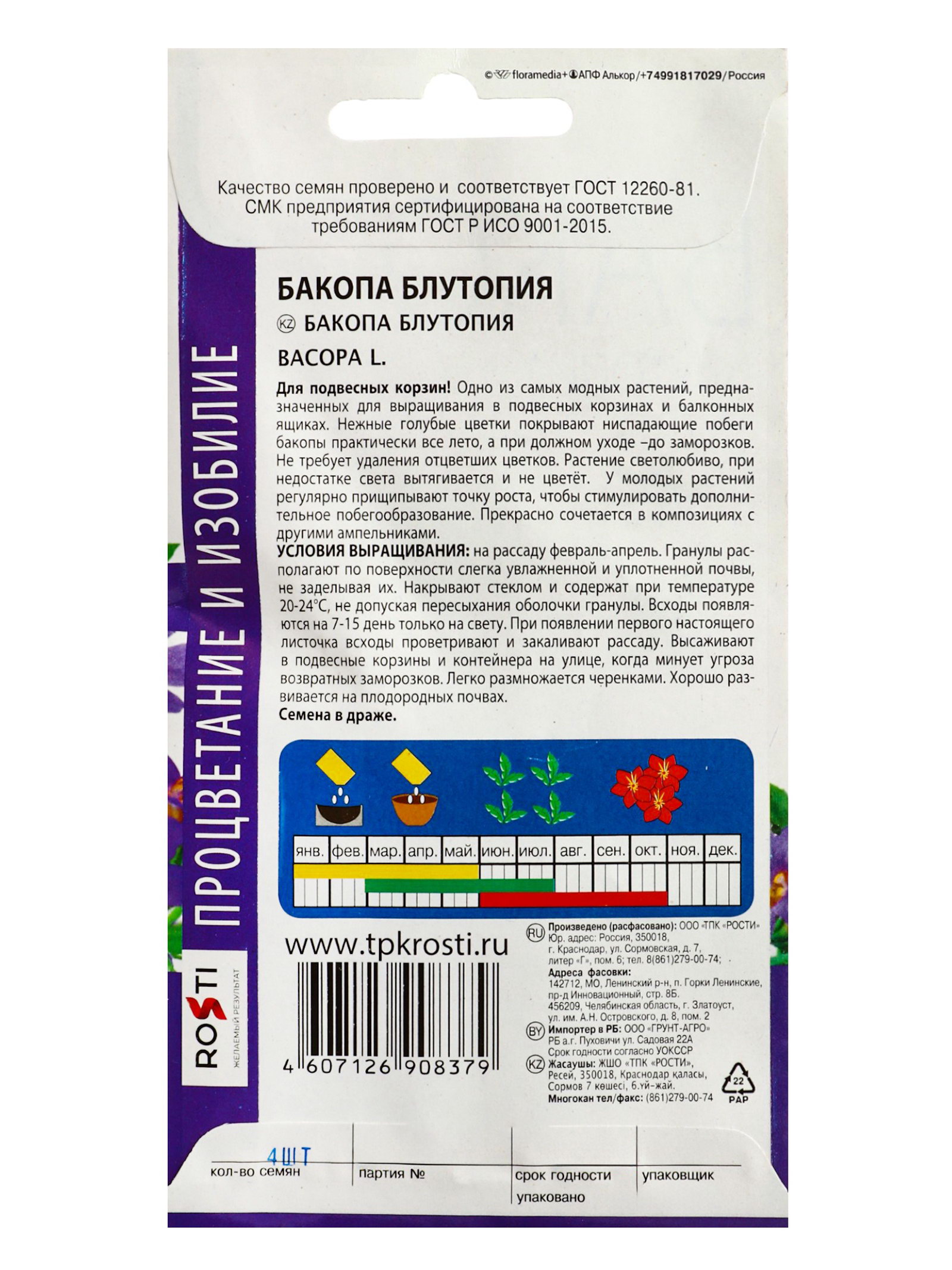 Посев на рассаду: Апрель, Май, Март, Февраль, Январь Цветение период: Август, Июль, Июнь, Октябрь, Сентябрь Посев (посадка) в грунт: Апрель, Июль, Июнь, Май, Март Размер упаковки: 8 x 0.3 x 15 см. tnved: 1209913000 Температурное ограничение: Нет Цвет: Фиолетовый Вид: Бакопа Вегетация: Однолетники Высота растений: 30-60 см Отношение к свету: Рассеянный свет Нуждаются ли в стратификации: Нет Махровые: Нет Сухоцвет: Нет По форме куста: Ампельная Место выращивания: Открытый грунт Разновидность: Цветущее | ||