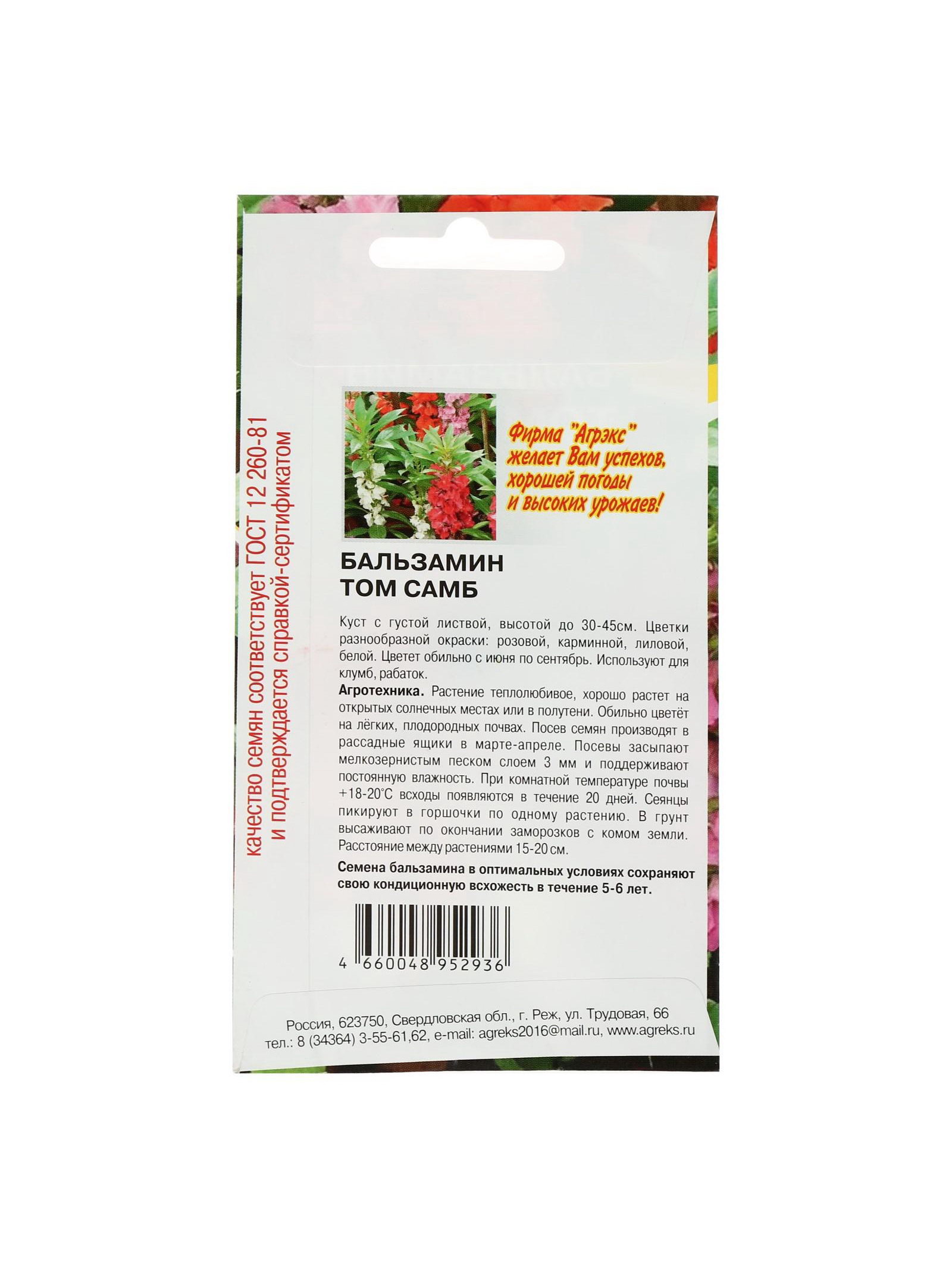 Семена цветов однолетние Бальзамин "Том Самб" 0.1 г, АГРЭКС, Россия