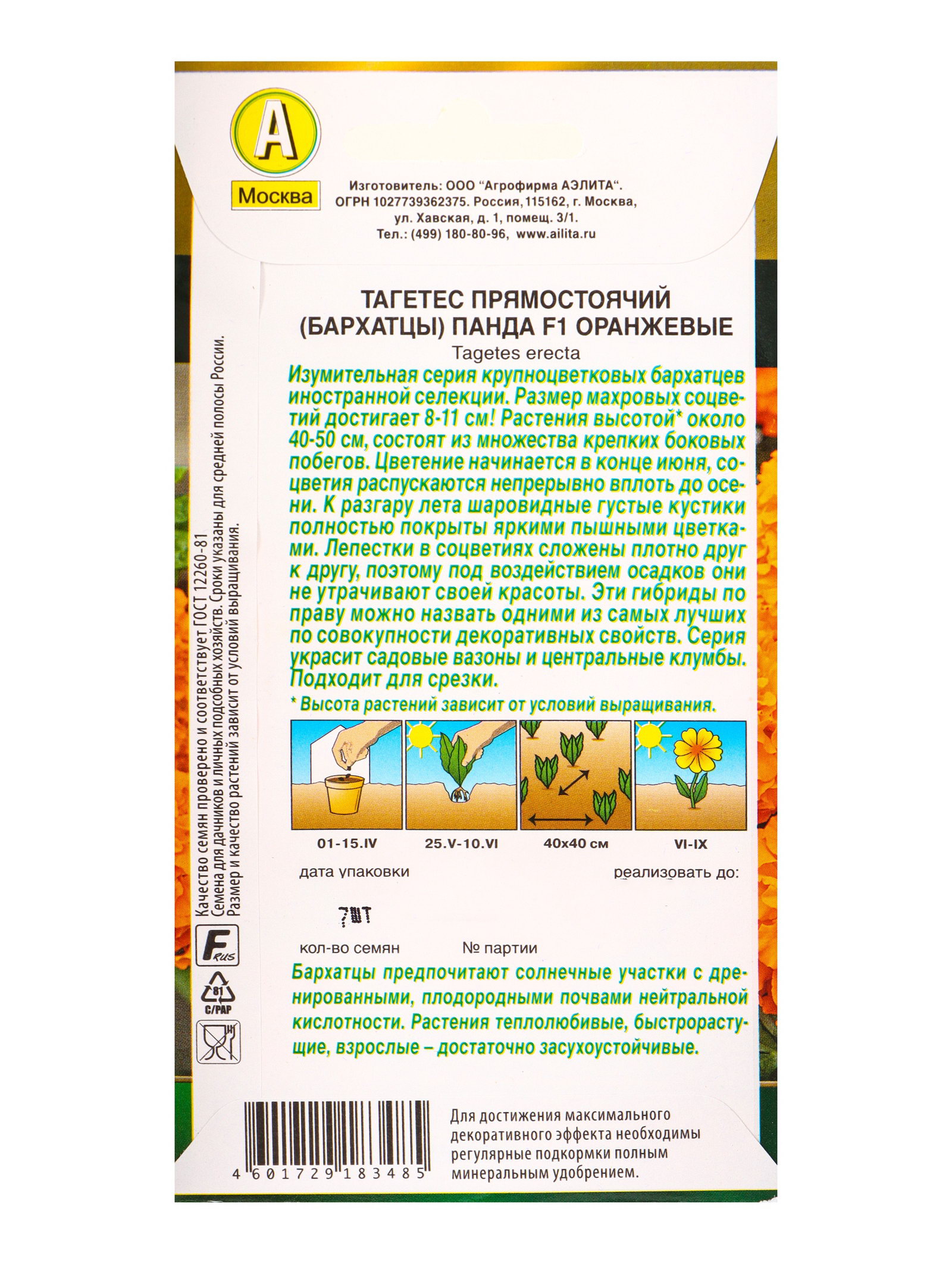 Семена цветов Бархатцы Панда F1 оранжевые прямостоячие Золотая серия, Ц/П,7 шт., Агрофирма АЭЛИТА, Россия