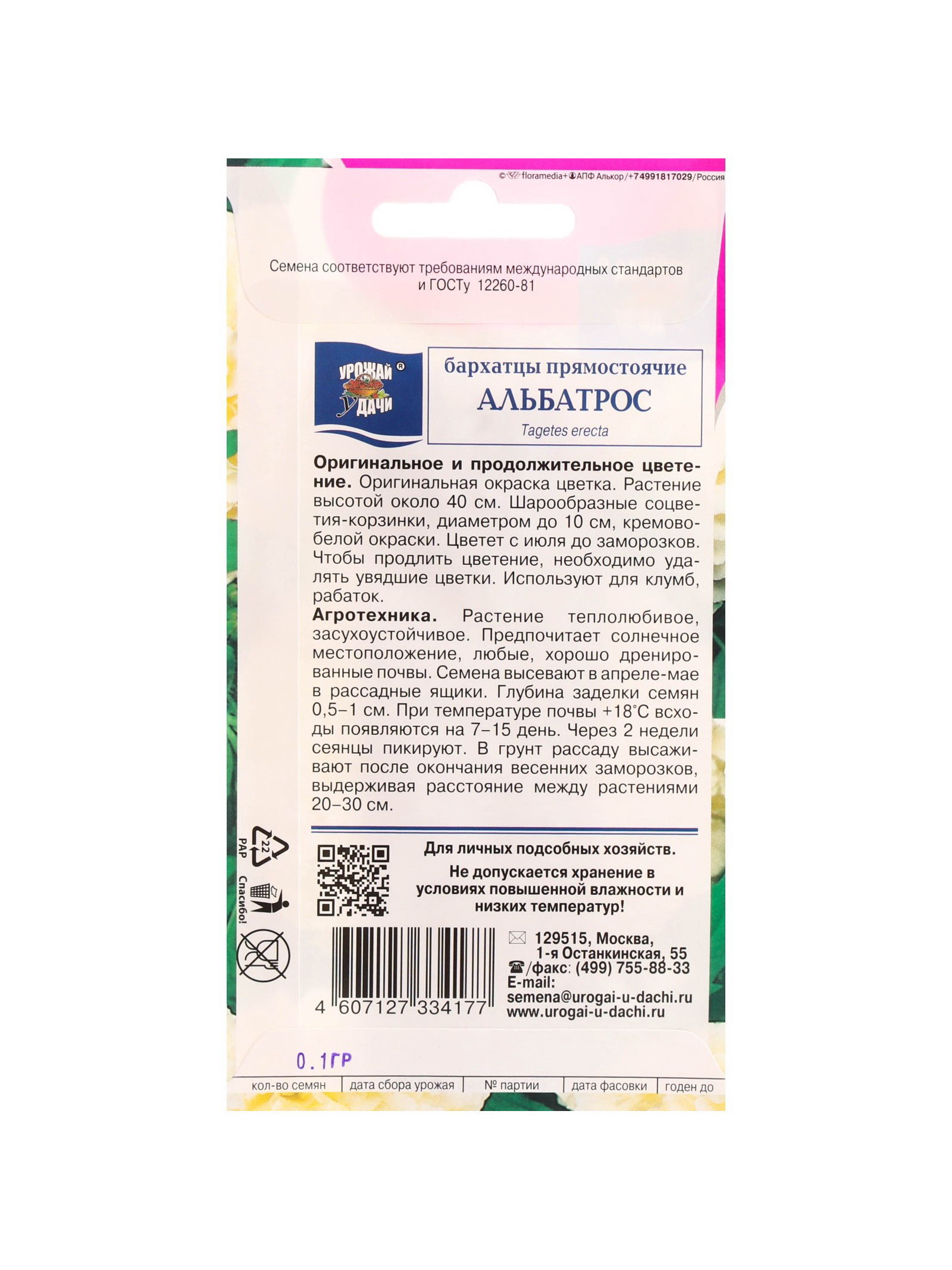 Набор семян Бархатцы прямостоячие "Альбатрос", махровые, 5 шт., 9x17x1 см., Мой выбор, Россия