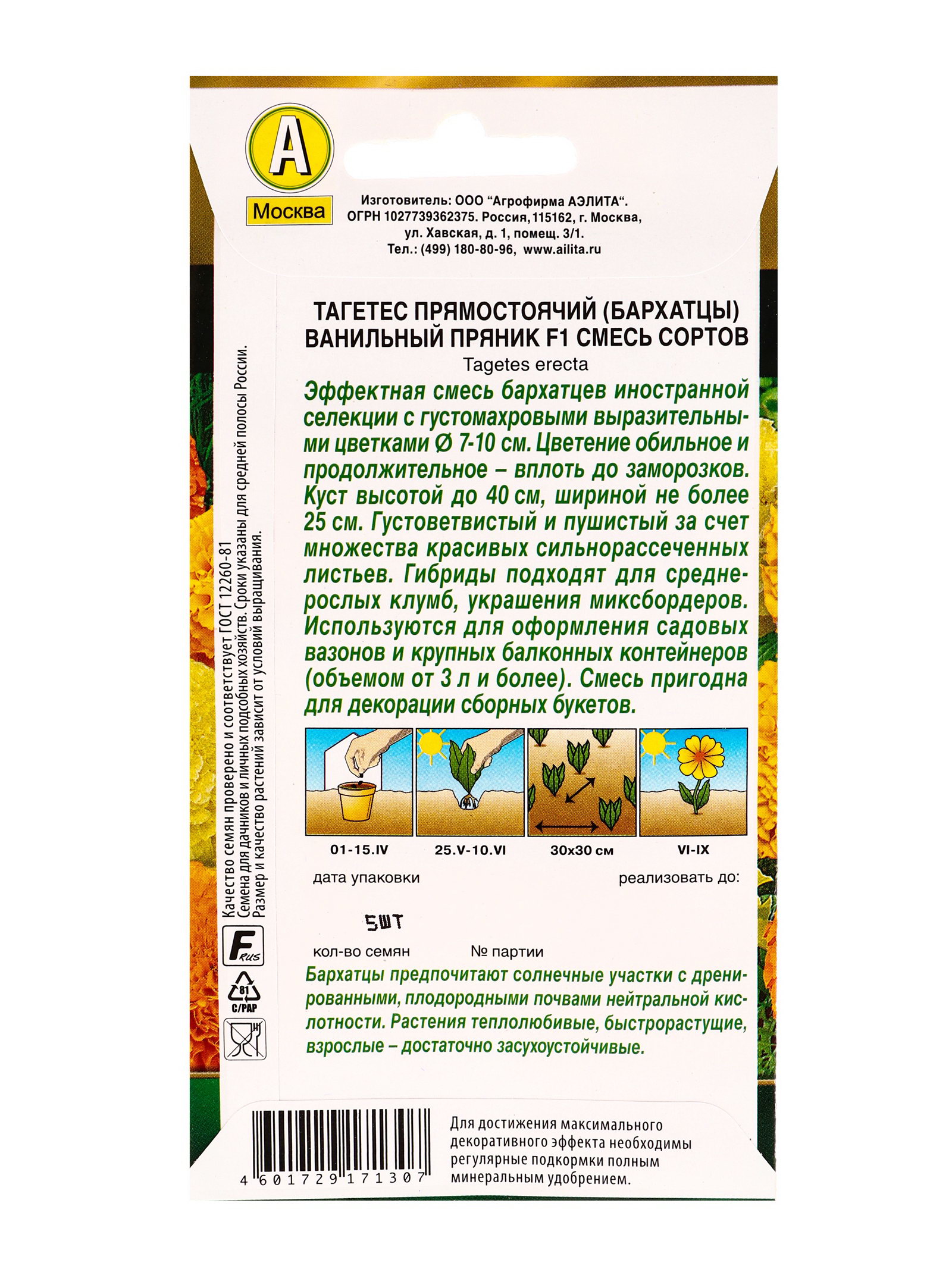 Семена цветов Бархатцы Ванильный пряник F1, смесь сортов Золотая серия, Ц/П,5 шт., Агрофирма АЭЛИТА, Чили
