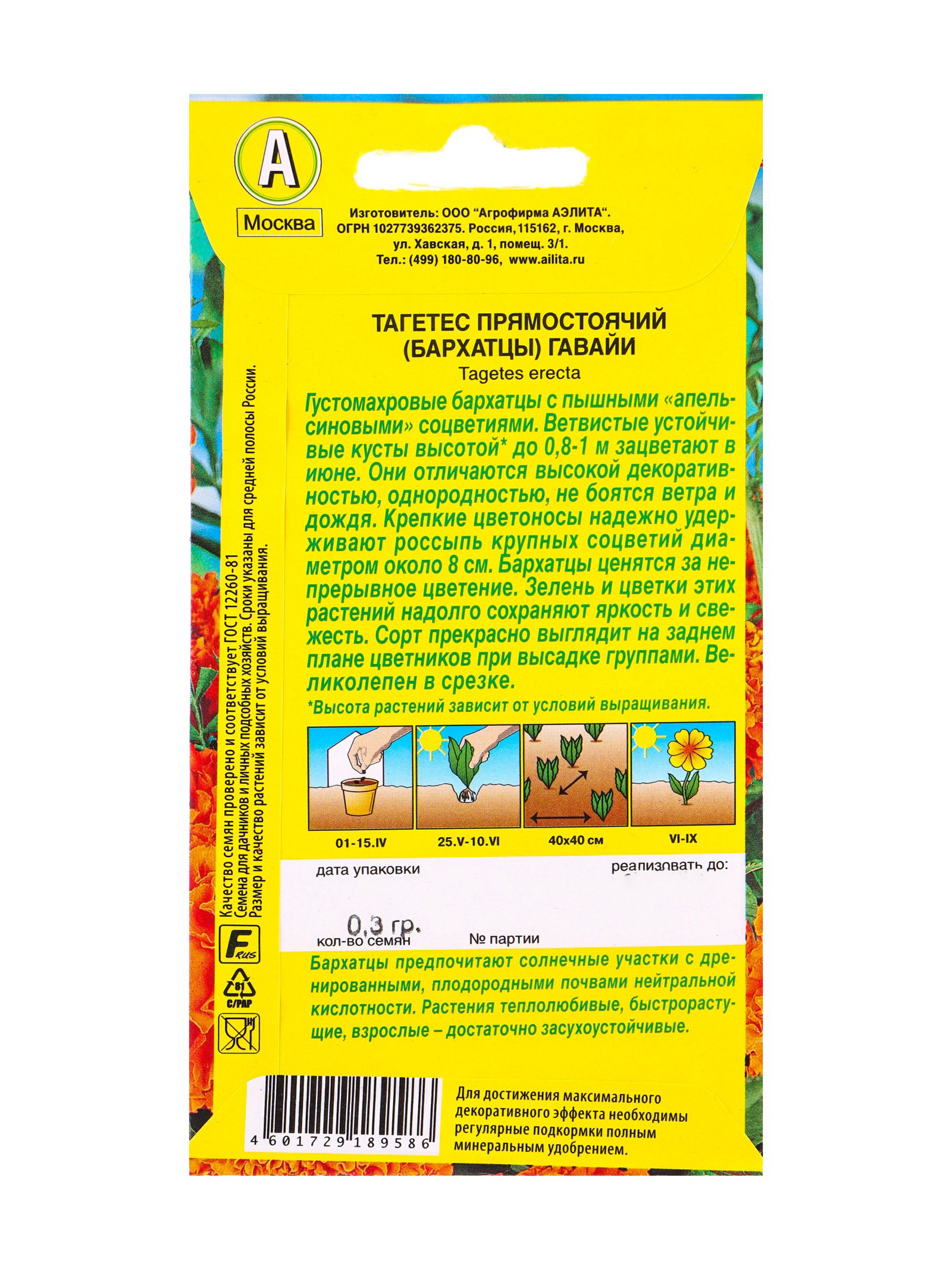 Семена цветов Бархатцы Гавайи прямостоячие, Ц/П,0.3 г, Агрофирма АЭЛИТА, Россия