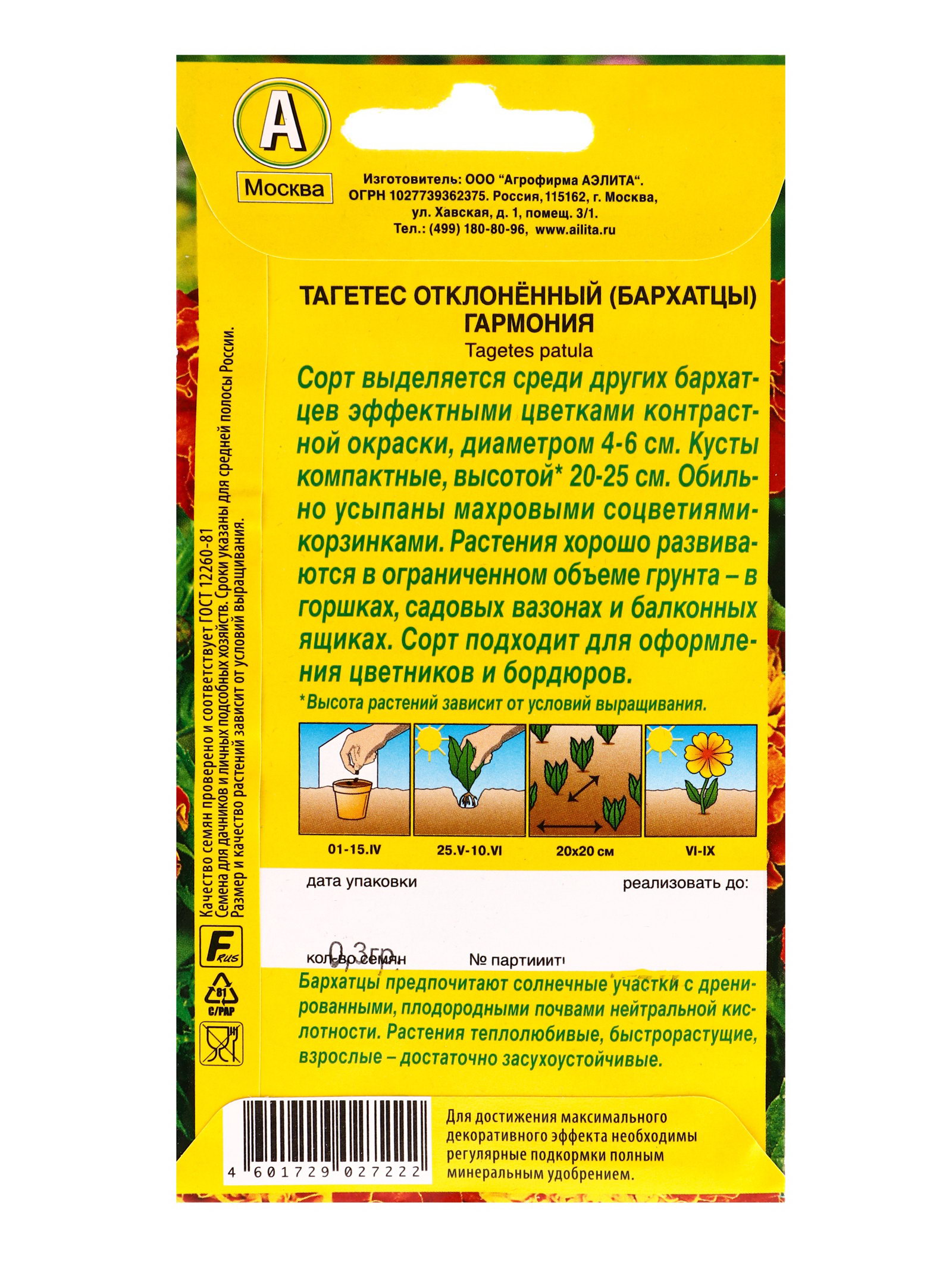 Семена цветов Бархатцы Гармония отклоненные, Ц/П,0.3 г, Агрофирма АЭЛИТА, Нидерланды