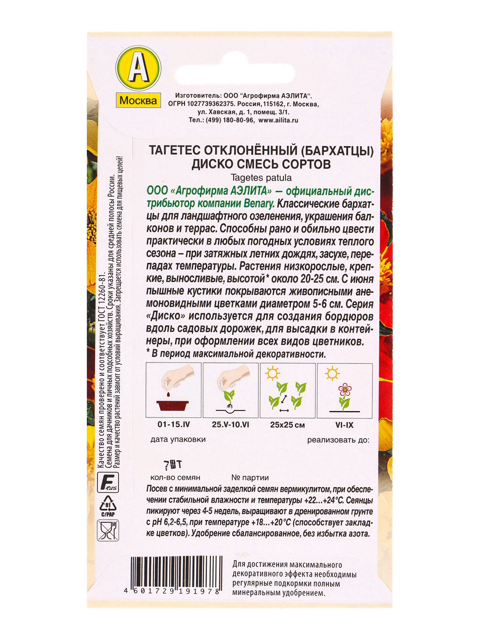 Семена цветов Бархатцы Диско отклоненные, смесь сортов Спецсерия Benary, Ц/П,7 шт., Агрофирма АЭЛИТА, Германия