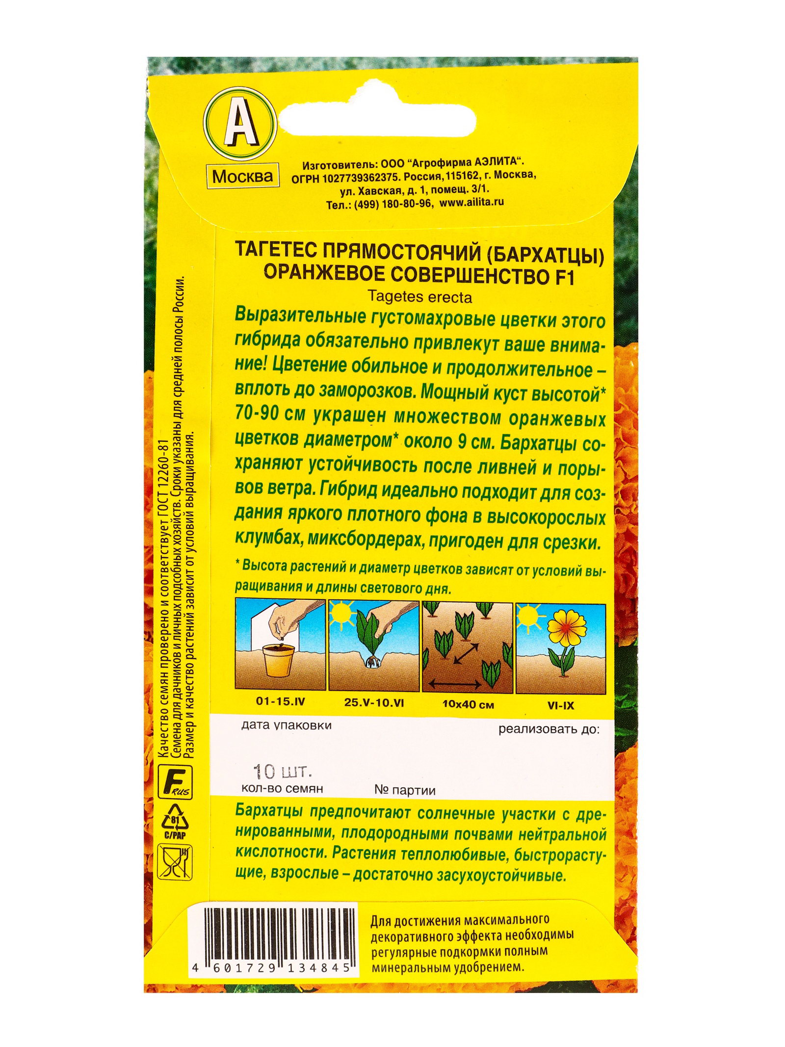 Семена цветов Бархатцы Оранжевое совершенство F1 прямостоячие, Ц/П,10 шт., Агрофирма АЭЛИТА, Нидерланды