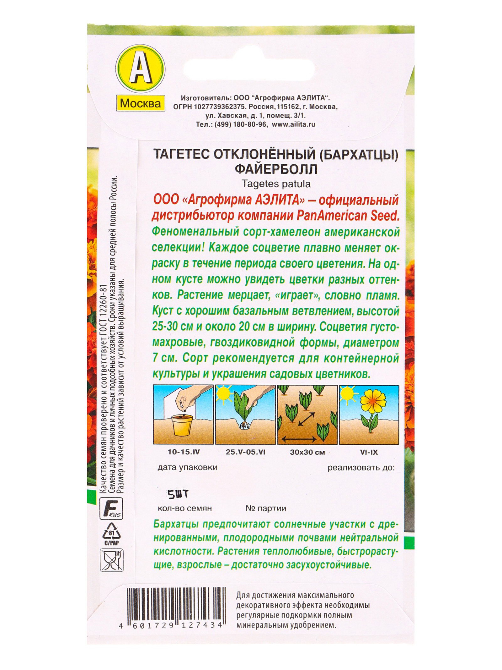 Семена цветов Бархатцы Файерболл отклоненные Спецсерия PanAmerican, Ц/П,5 шт., Агрофирма АЭЛИТА, Чили