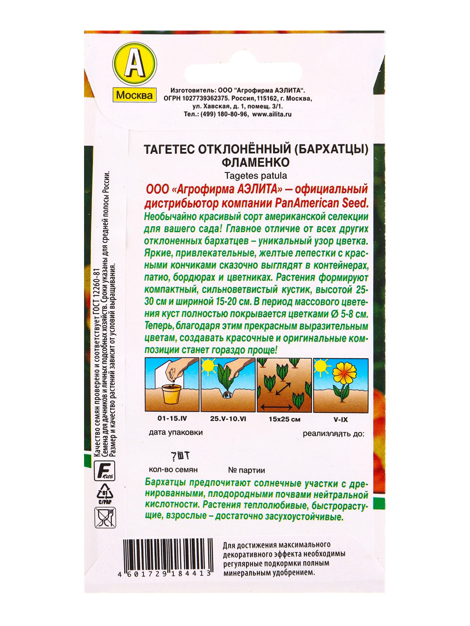 Семена цветов Бархатцы Фламенко отклоненные Спецсерия PanAmerican, Ц/П,7 шт., Агрофирма АЭЛИТА, Китай