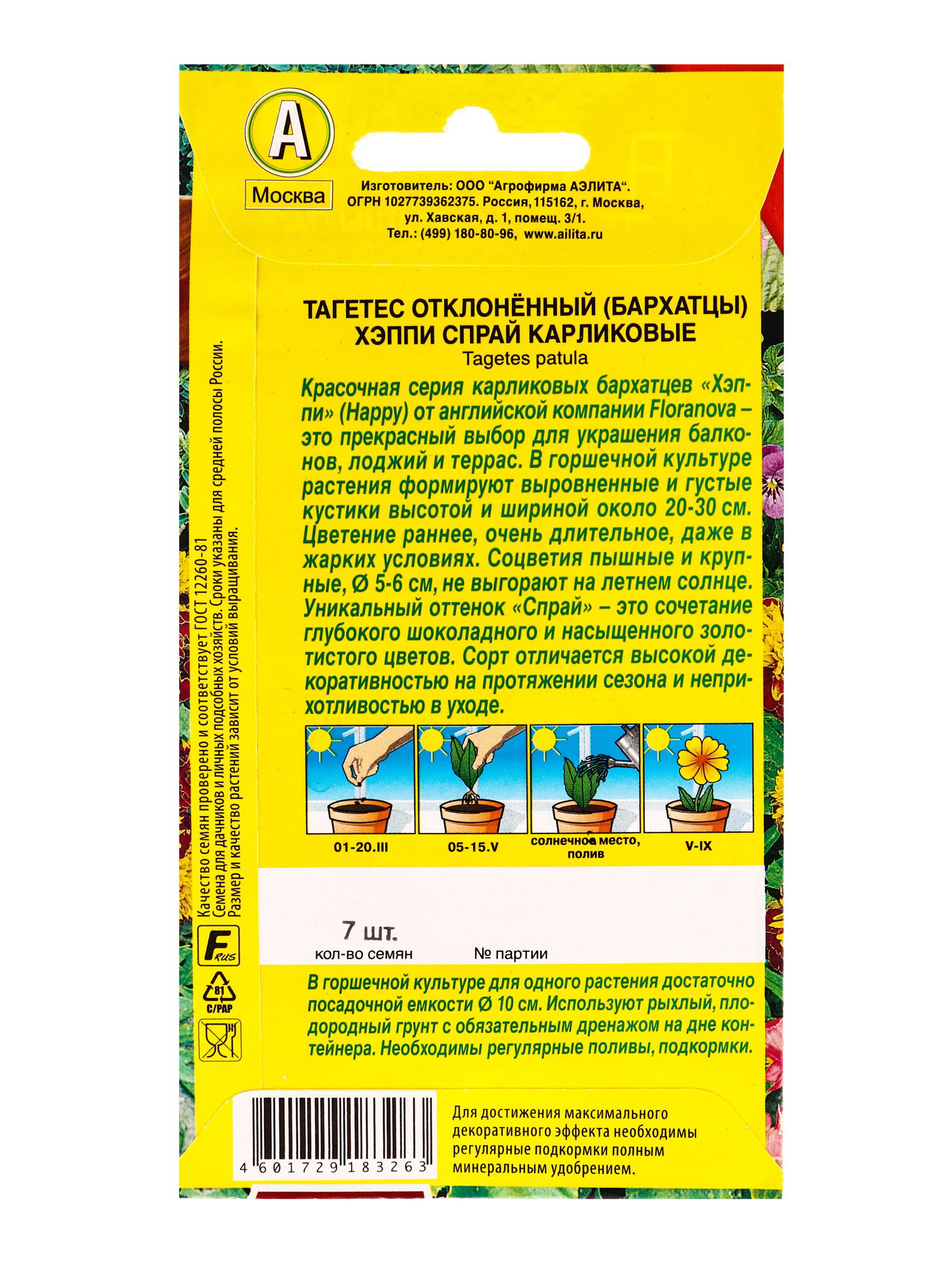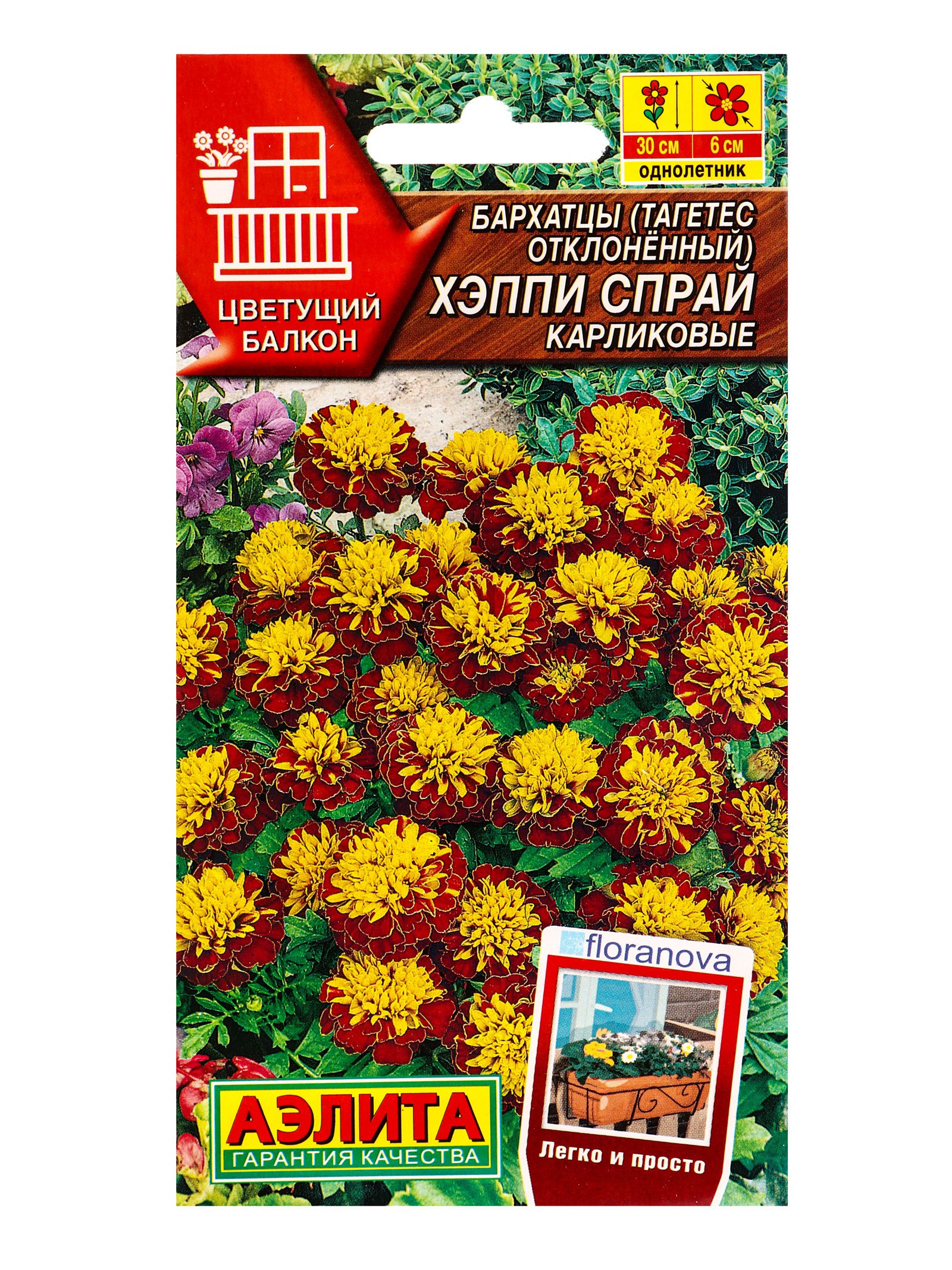 Семена цветов Бархатцы Хэппи спрай карликовые С. Floranova Цветущий балкон, Ц/П,7 шт., Агрофирма АЭЛИТА, Чили